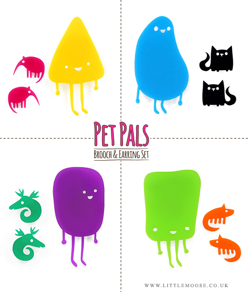 Inspired by our love of animals, our Pet Pal earring and brooch sets each consist of 1 happy pet owner brooch and a pair of cute animal shaped stud earrings. There are 4 sets to choose from, each featuring a different array of weird and wonderful critters and characters. We'd love to know who your favourite is so why not tell us on Twitter or Facebook.