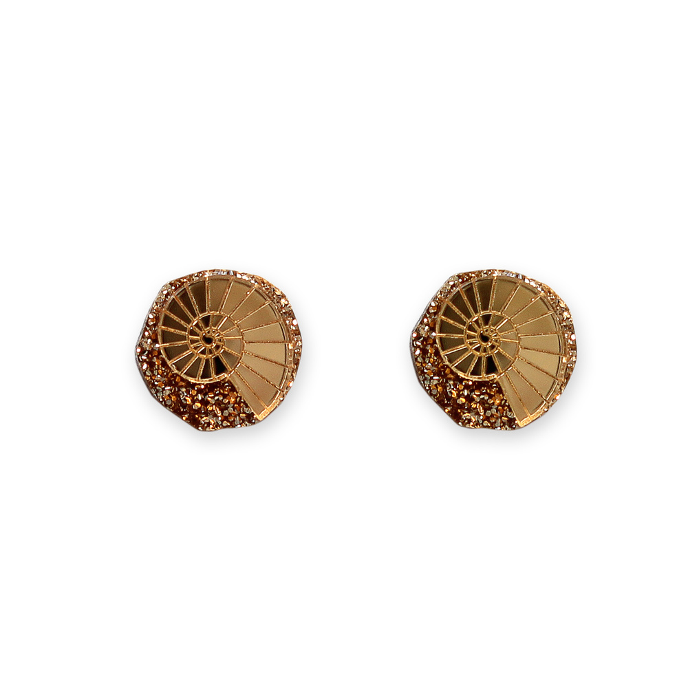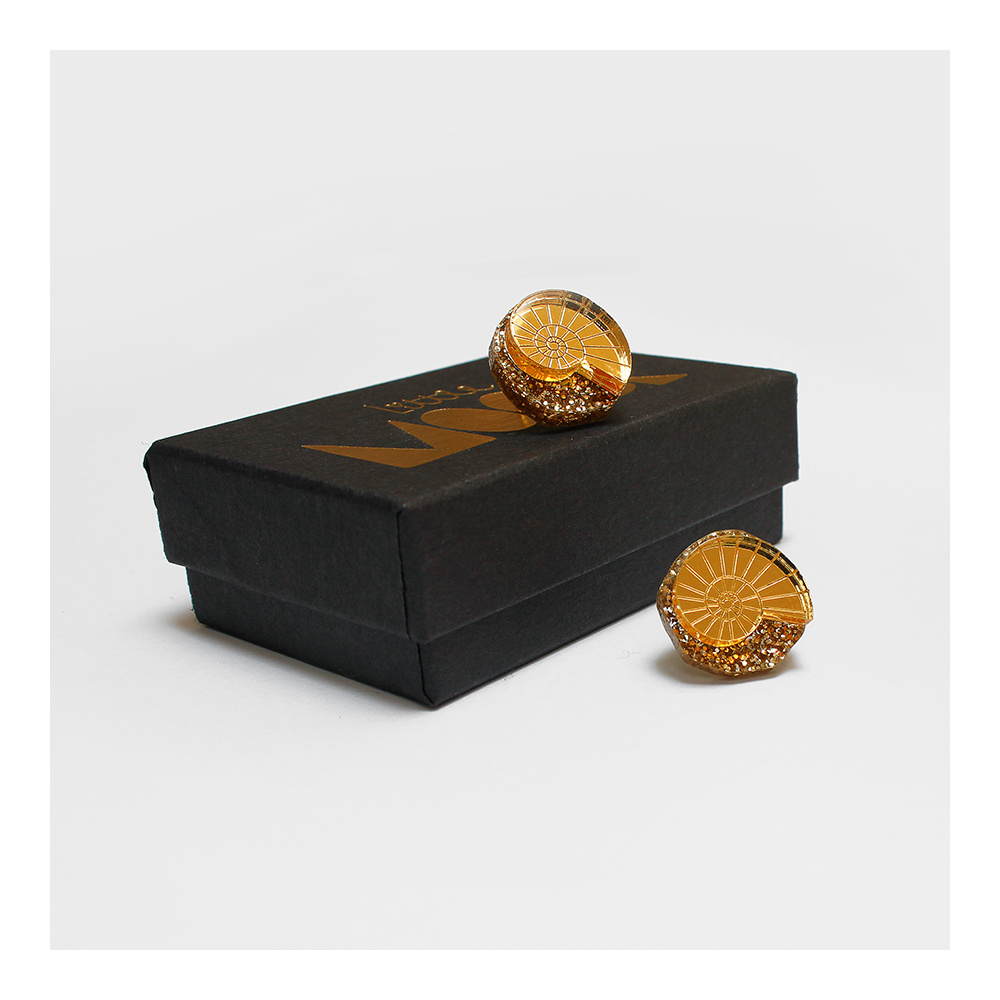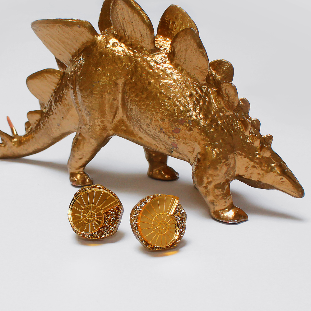 Add some jurassic glamour to your jewellery box with our delicate, golden Ammonite earrings. These pretty stud earrings feature a mirrored gold ammonite fossil against a glittering gold 'rock'. They might look like they are a million years old, but they'll make you feel like a million dollars!