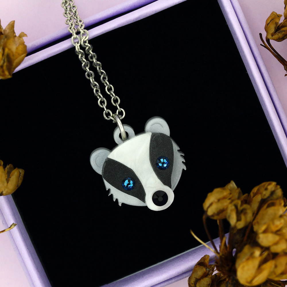 You're all sett (badger pun alert) with our lovely badger charm necklace. Handmade from beautiful swirling white and black pearl acrylic, our badger charm necklace has beaming blue crystal eyes and is available on a silver tone or gold plated chain.