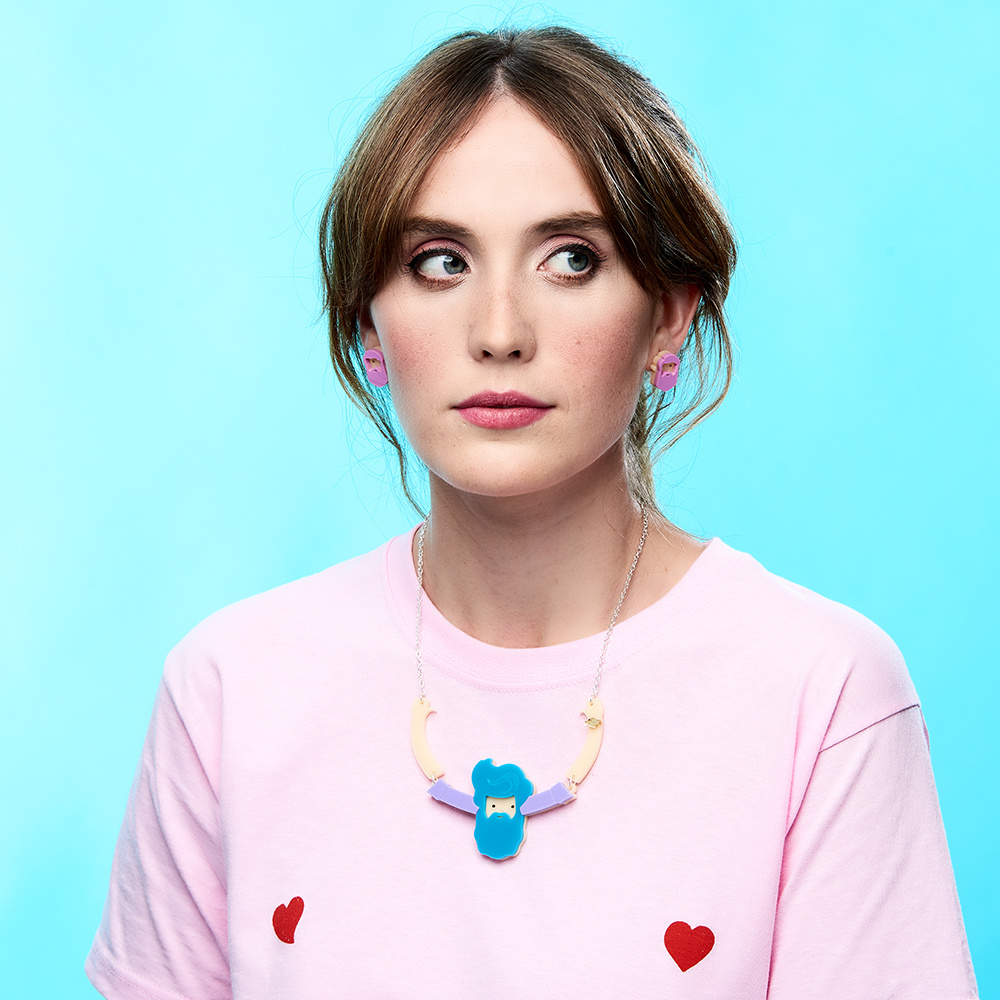 This quirky necklace features a lovely looking chap with a turquoise beard, lilac shirt and gold watch. Thumbs up all around. Handmade in the UK by Little Moose.