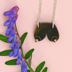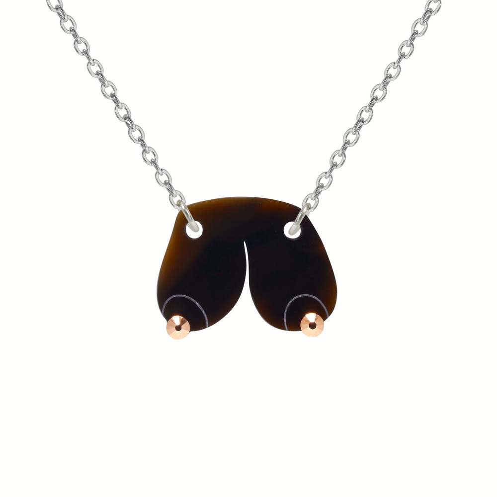 Boobs,boobs, glorious boobs - big ones, little ones, wonky ones, wobbly ones. This quirky boobies necklace celebrates the glorious boob and features hand inked detail, a gorgeous espresso coloured acrylic and a pair of glistening pink crystal nips. Whats not to love?