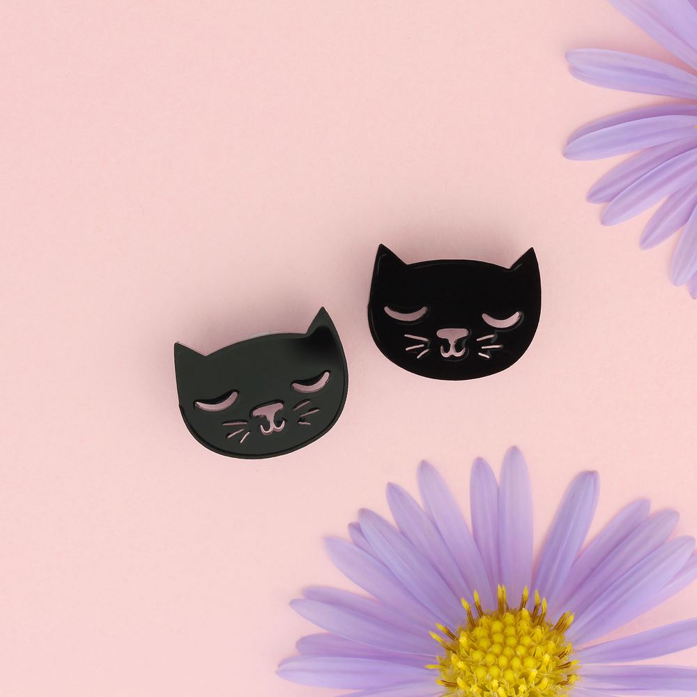 These cute black cat face stud earrings are made from lasercut acrylic and have silver plated backs. They're great fun and would make a perfect gift for a cat lover.