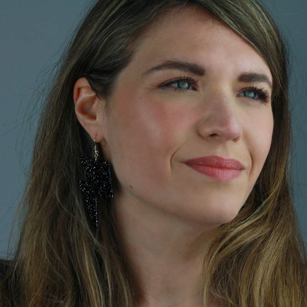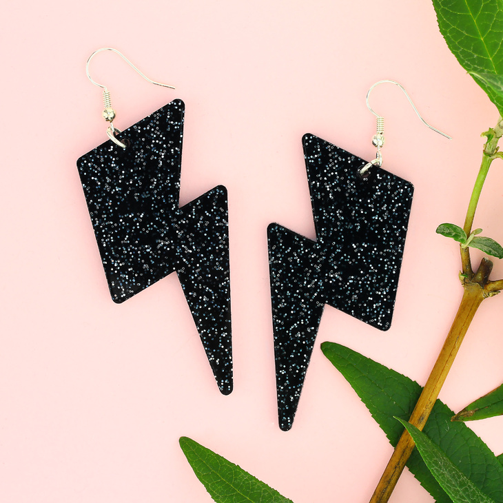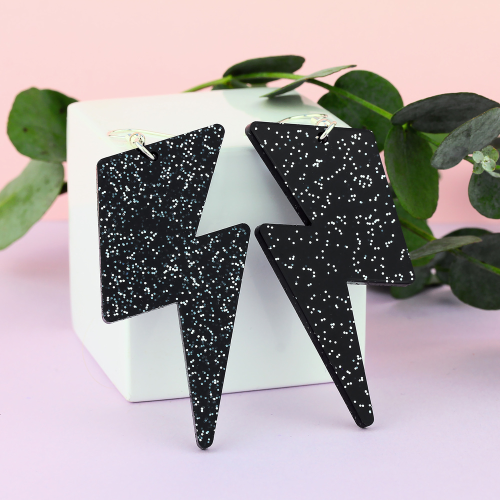 Our statement zig zag lightning bolts are fully charged with positive vibes. Grab yourself a pair and set yourself up for the electric boogaloo. Handmade in our Sussex studio from glittered black, lasercut acrylic. Our earring hooks are hypoallergenic stainless steel.
