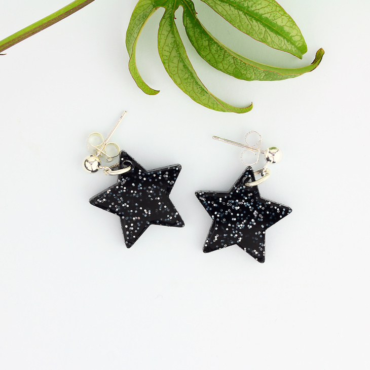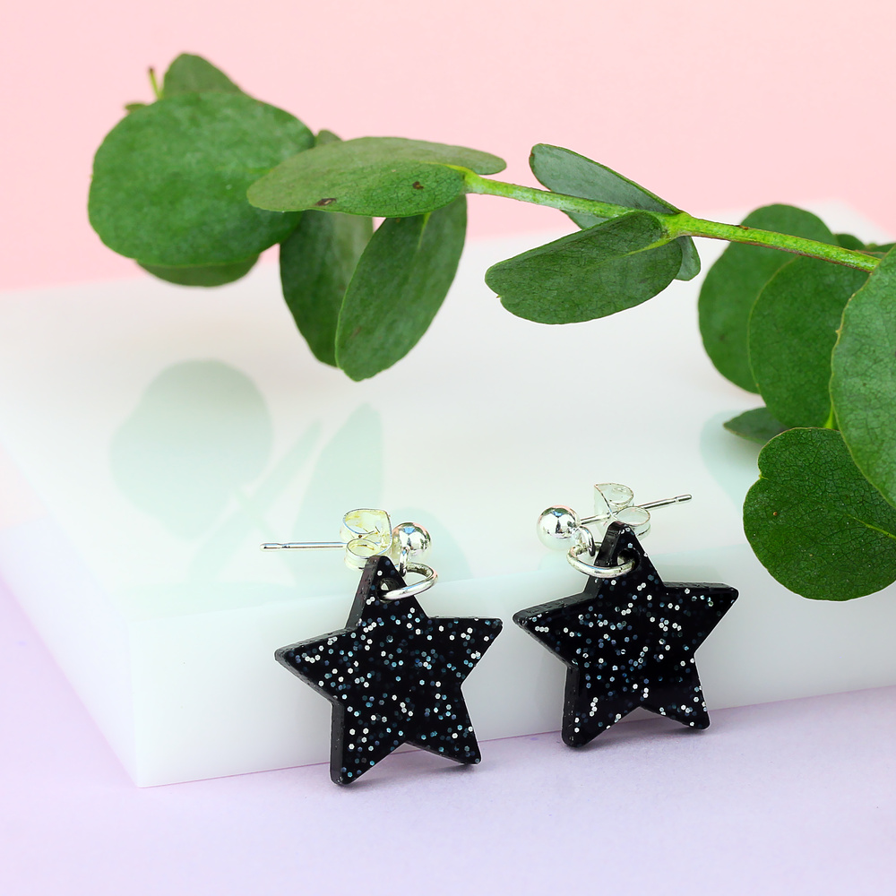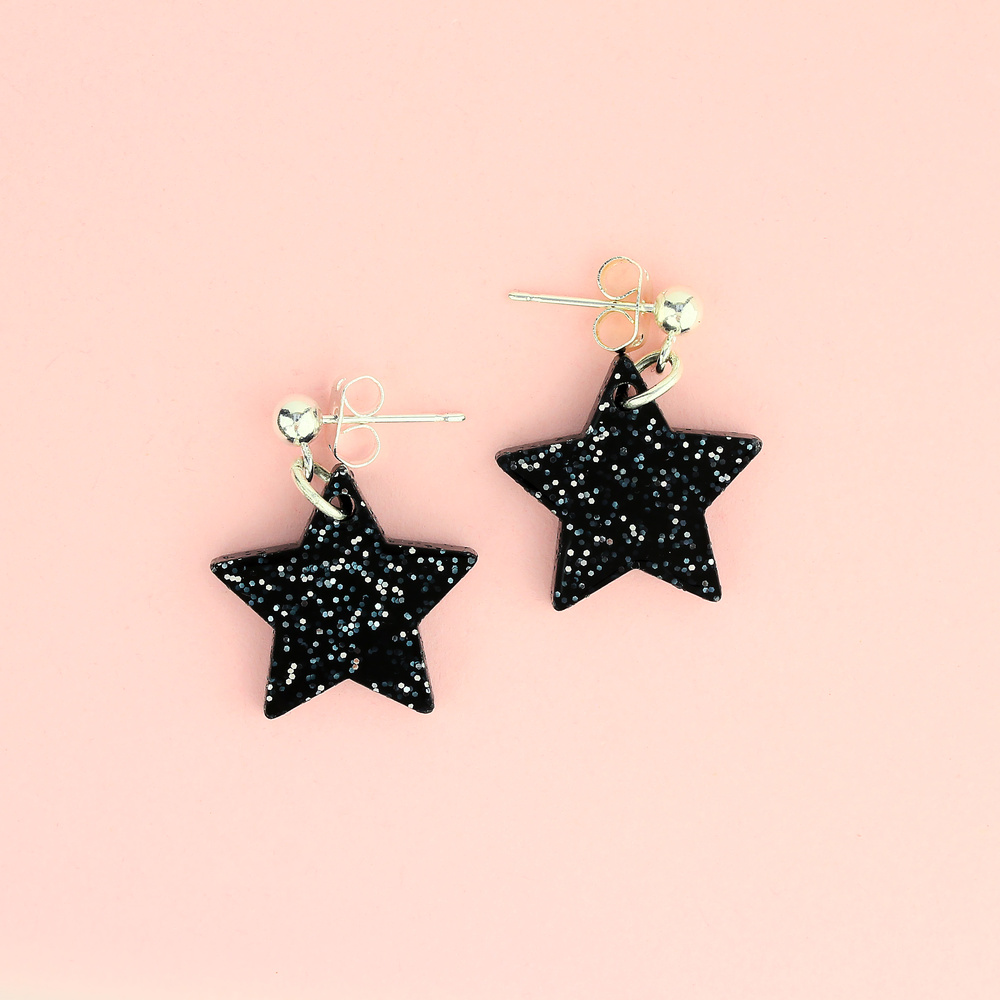 These glitzy glitter black star studs will match any occasion with ease. Gently swinging from silver plated drop studs, our star earrings are all packaged in a Little Moose gift box. Be the shining star that you are.