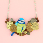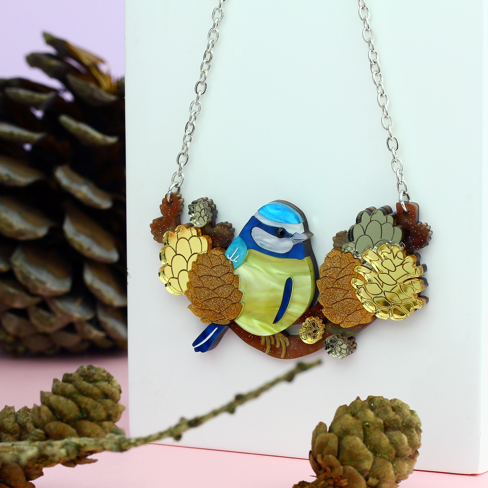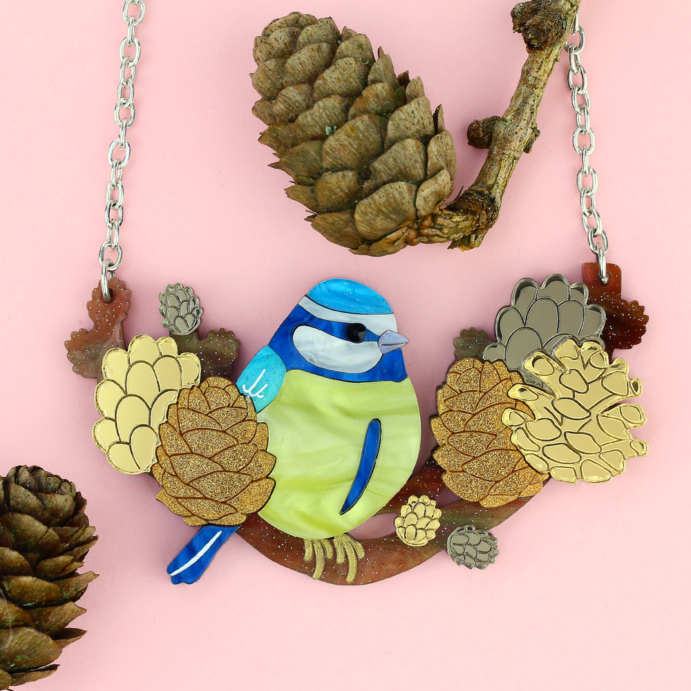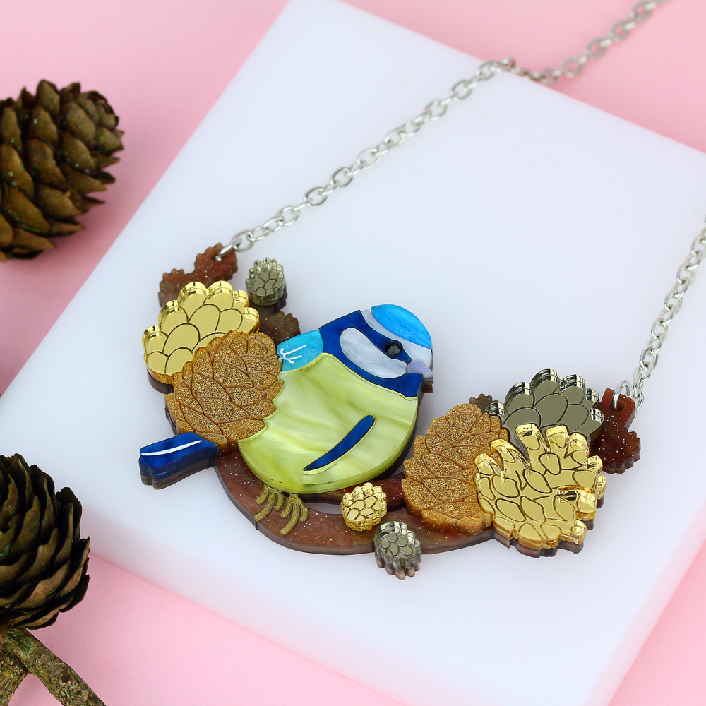 Nestled between golden and bronze pinecones, our handsome blue tit is handmade from pieces of rich royal blue, punchy cyan and bright yellow luxury marbled acrylic and is finished off with hand inked detail and a crystal eye. We handmake all of our jewellery with love and care.