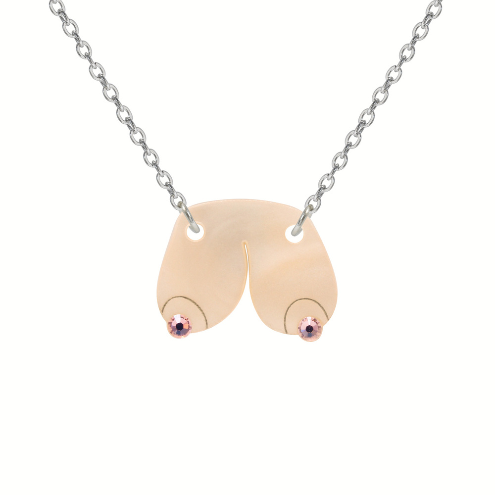 Boobs,boobs, glorious boobs. This cheeky booby necklace features hand inked detail, a gorgeous pearl acrylic and a pair of glistening pink crystal nips. Get your hands on these (ooh err!) while you can.