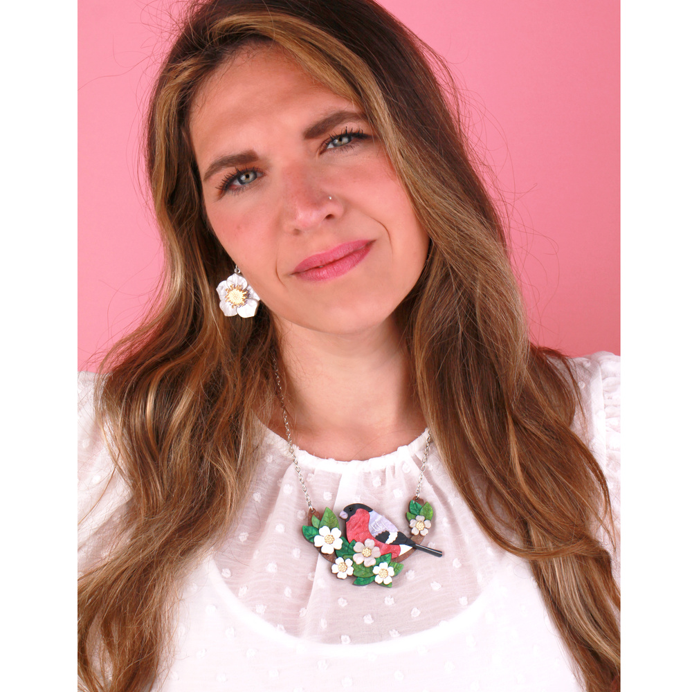 Our pretty Bullfinch is nestled amongst white spring blossoms which have a glistening etched gold centre against a gorgeous hand mixed glitter, chocolate brown branch. Our bullfinch features a striking, trademark pink orange chest which has glittered sparkles, black marble head, gorgeous moonlight grey wing and hand inked feather details, as well as a sparkling black crystal eye. The beautiful bullfinch is surrounded by luxury green marbled acrylic leaves. We handmake all of our necklaces in our Sussex studio with love and care. A simple, elegant necklace that captures the beauty of the bullfinch.