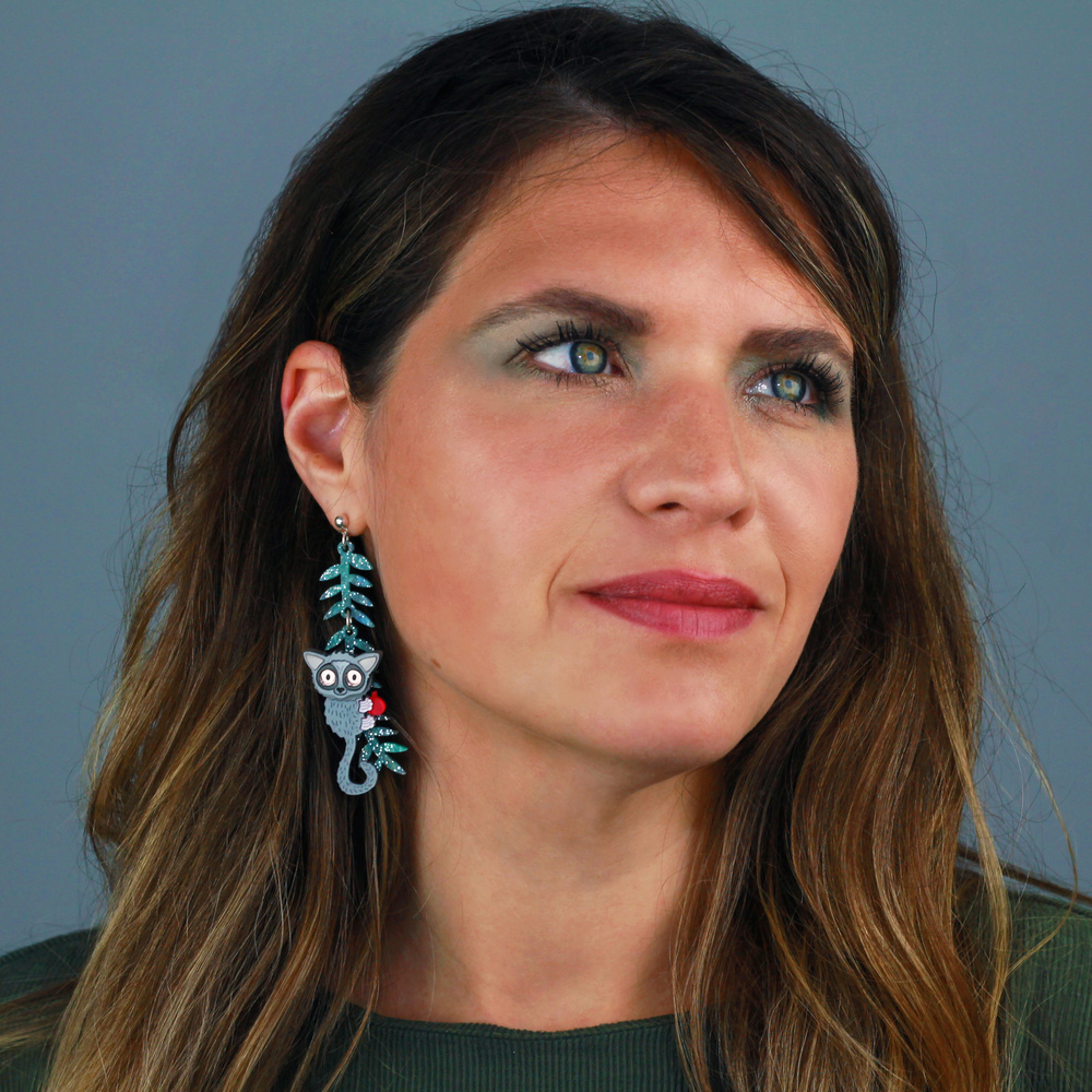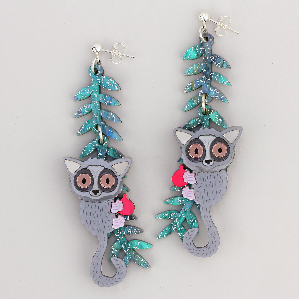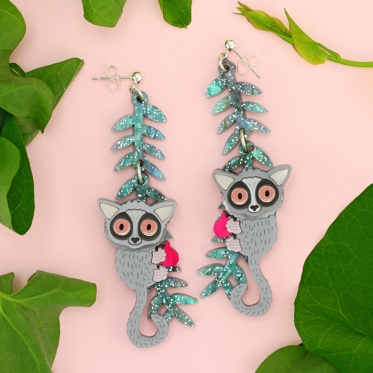 Our bright eyed bushbabies are hanging around amongst the glittery green foliage feasting on a juicy fig, oh what a life to lead. This pair of bushbaby statement earrings are carefully handmade from intricately detailed laser cut acrylic (keeping them nice and light) and feature mirrored rose gold eyes with a silver plated stud finding.