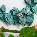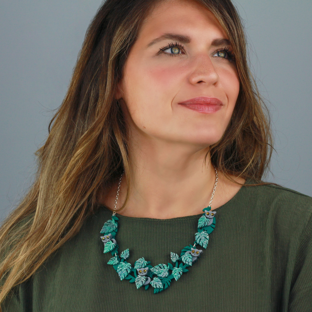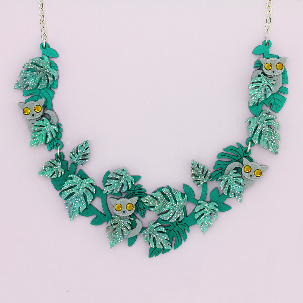 Forget the Beatles, there is a new fab four in town - the Bushbabies. Hiding behind glittery green foliage, with bulging crystal eyes, our Bushbaby Treetop necklace is a real showstopper. Lovingly handmade from layers of laser cut acrylic, each bushbaby is a platinum colour with etched detailing.
