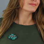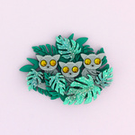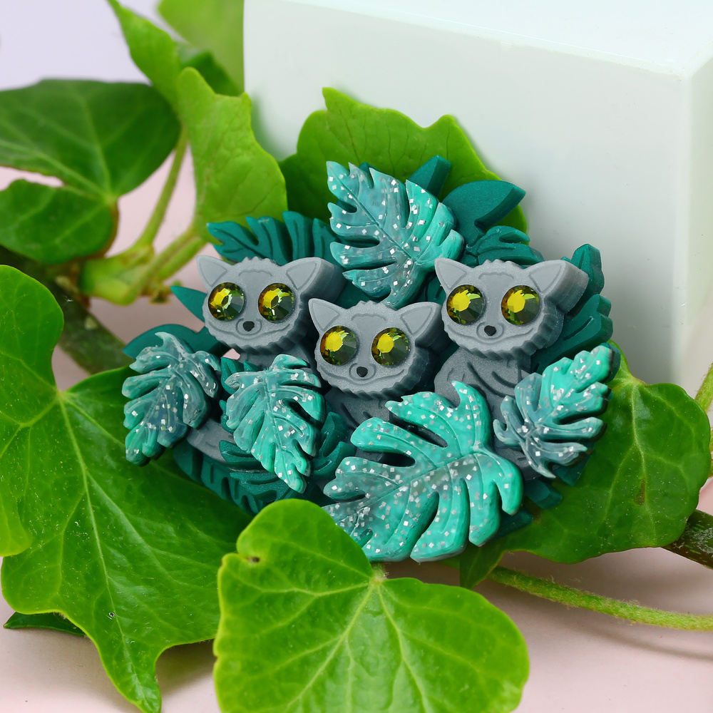 Our eye catching bushbaby brooch features three cheeky bushbabies peeking out from behind a lush jungle canopy, featuring layers of royal and glittered green. Each cute bushbaby features two huge crystal eyes, adding some sparkle to the sweet. Lovingly handmade by us in the UK from pieces of laser cut acrylic.