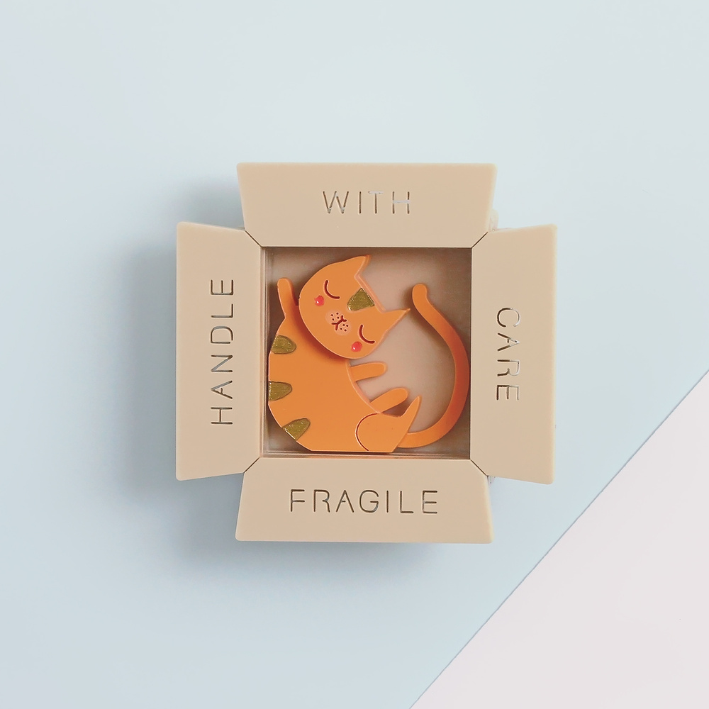 Our sleeping orange cat features hand inked golden stripes and pink cheeks. Layers of laser cut perspex come together to create a brooch with real depth.