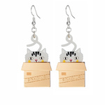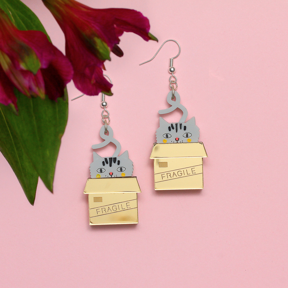 Celebrate your furry friends love of cardboard with these playful earrings. Our cheeky grey cat is happily chilling out in its palacial golden box, just like any good cat would. Handmade in the UK from layers of laser cut perspex, these earrings are finished with hand inked and etched detail and are sure to being a smile to any cat lovers face.