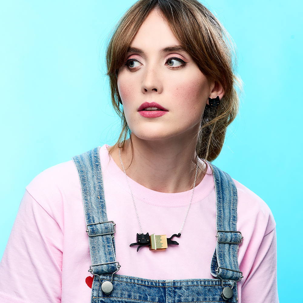 This curious kitty is diving through a golden cereal box. Give it a wiggle, our kitty moves backwards and forwards. A playful necklace for feline fans. Handmade in the UK from pieces of laser cut and etched perspex. Hand inked with gold cheeks and a pink nose.