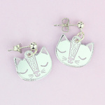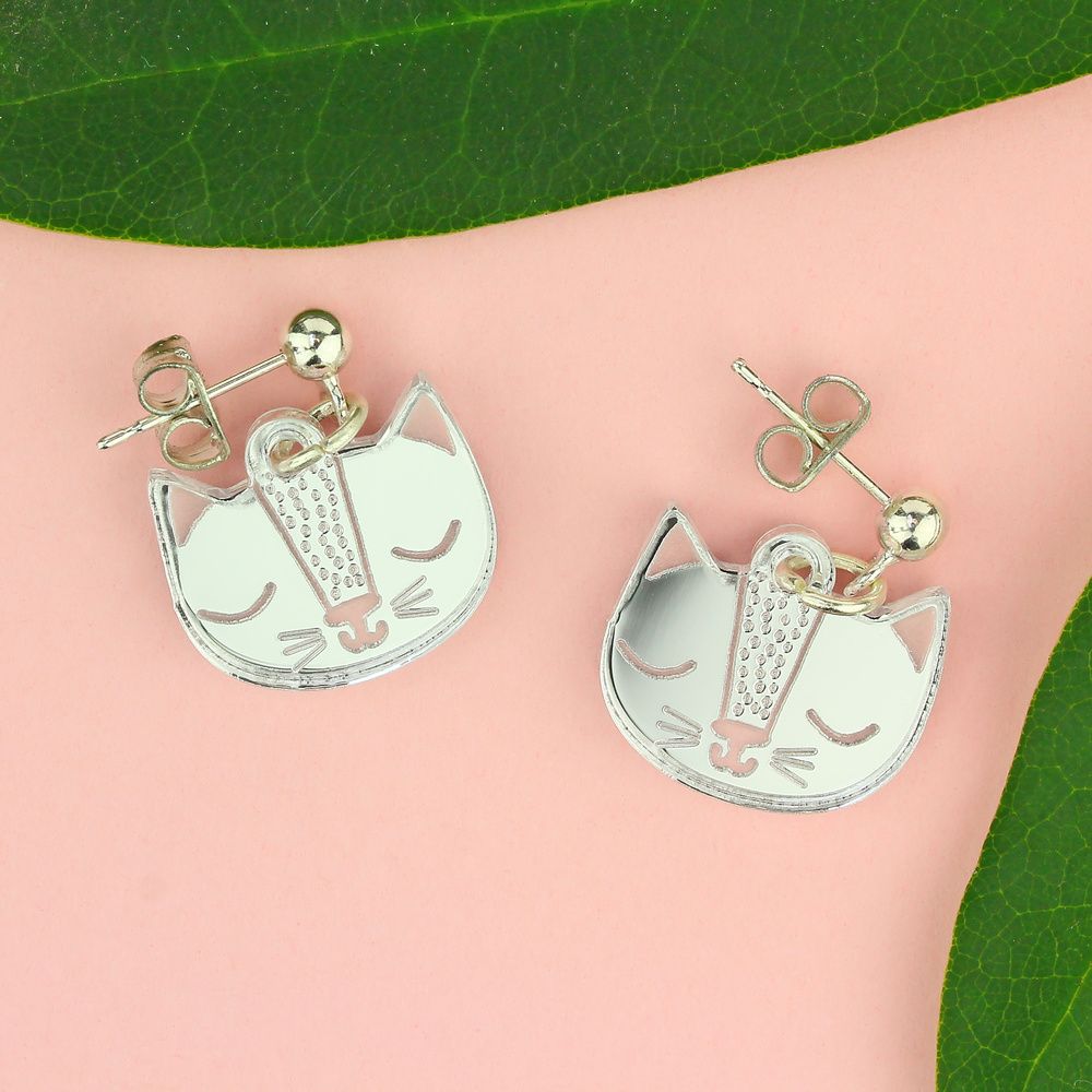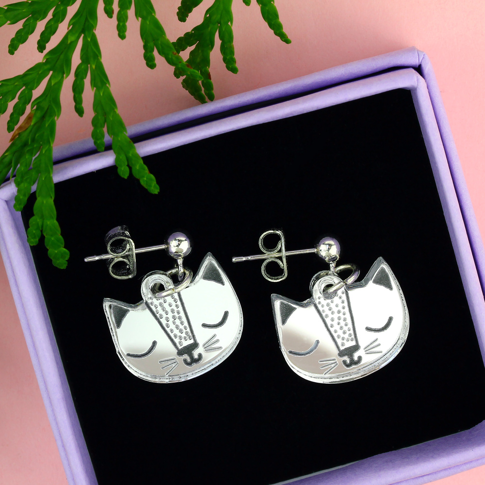 Our silver cat face stud earrings will have you feline fine in no time. Take this pair of purrrfect earrings with you wherever you go. Handmade in England from mirrored silver acrylic.