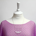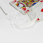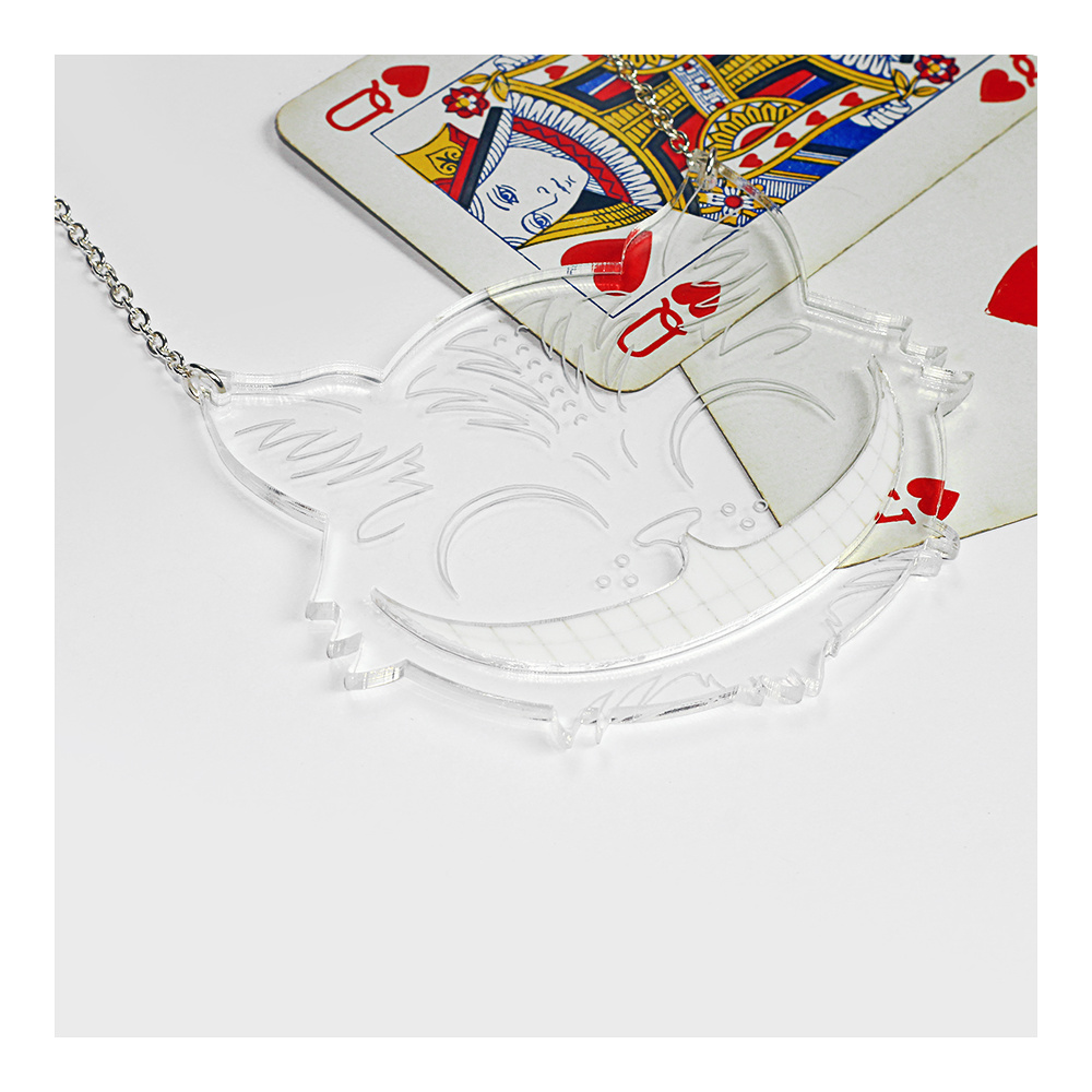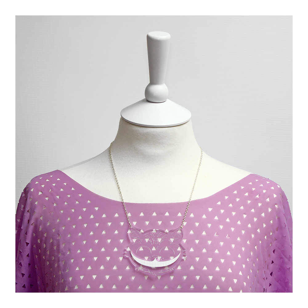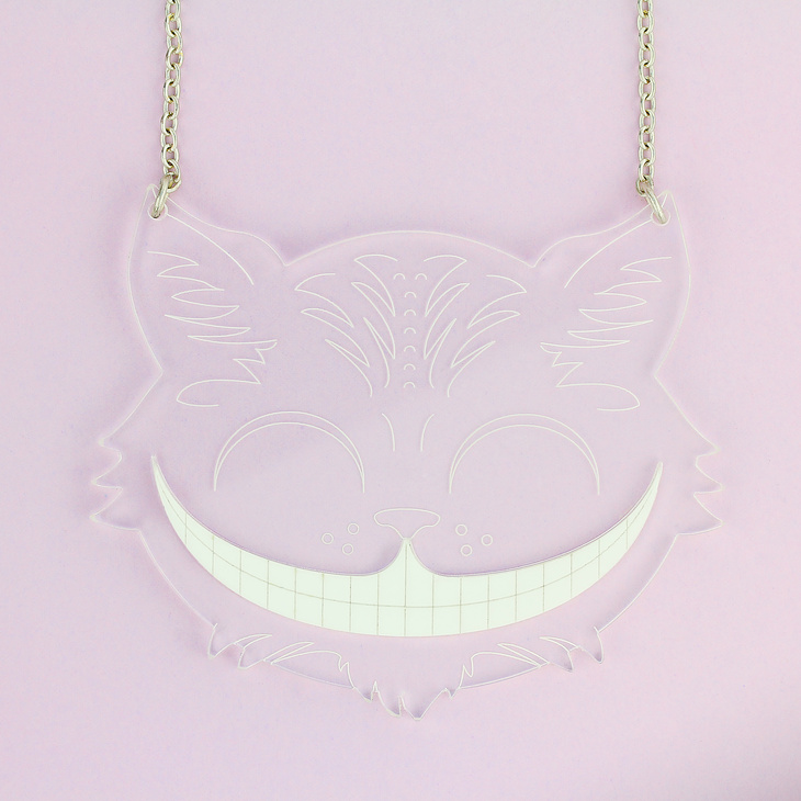 This clever necklace is made from transparent perspex, with lots of etched features - this means that the Cheshire Cat will blend into his surroundings with ease, and barely be seen - apart from that big bright white smile of his. A separate layer of white perspex means that this kitty critter can never disappear completely.