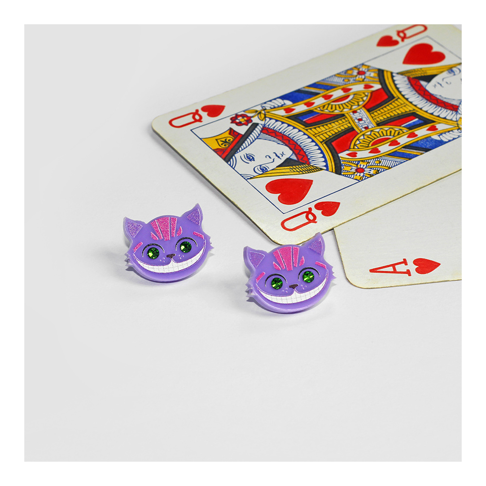 Take some of the madness with you, wherever you are, with our quirky Cheshire Cat purple stud earrings.