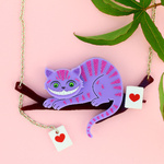 Featuring 2 green crystal eyes, our grinning Cheshire Cat sits on a branch (awaiting Alice) surrounded by playing cards. He is made from pieces of laser cut acrylic with printed detail.