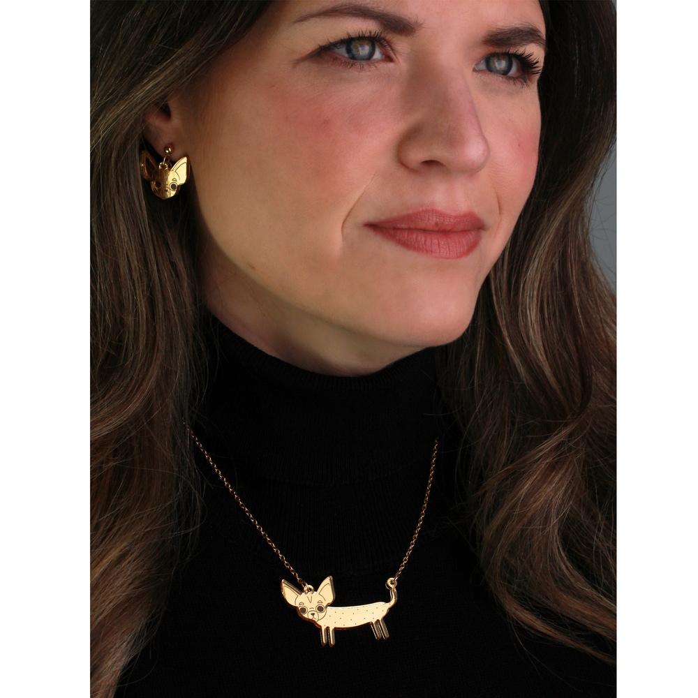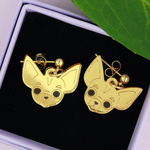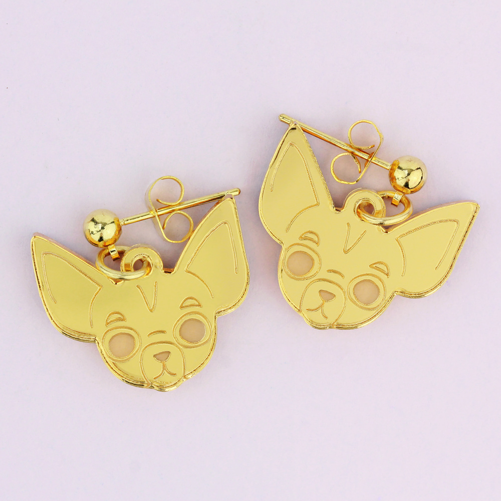 Hot diggety dog - our new Chihuahua earrings are ready and waiting for you. This cute pair of playful pups are etched onto an outfit enhancing mirrored gold and are lovingly designed and handmade in England by us.
