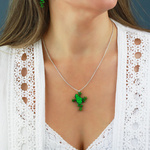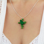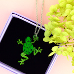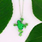Nobody wants a frog in their throat, but a frog around your neck is a whole different matter. Our common frog charm necklace sits above chest level and is handmade from a remarkable marbled apple green glitter and mirrored dark green acrylic. We finish each froggy with hand inked detailing.