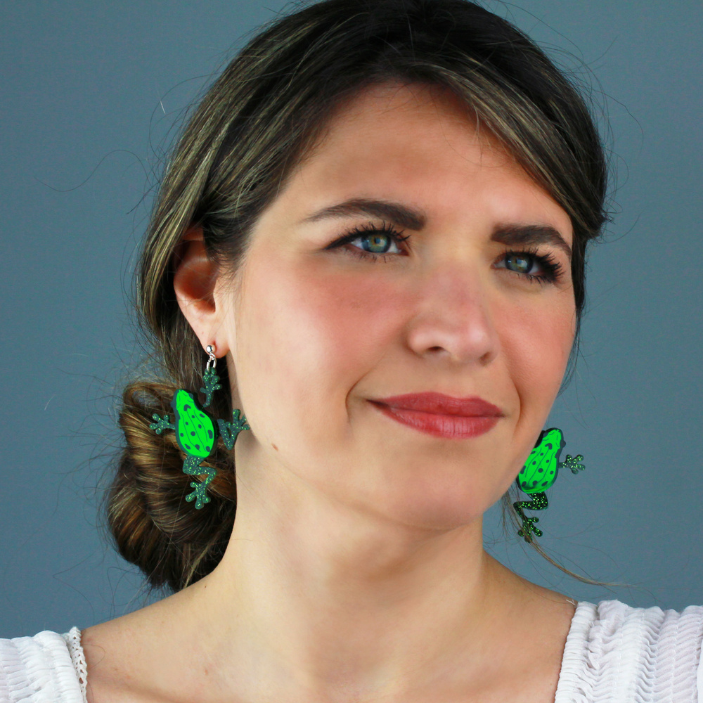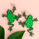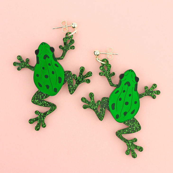 It's not easy being green, according to one famous frog - but it is certainly easy to fall in love with these statement frog earrings. Lovingly handmade from pieces of gorgeous glittered and dark green mirror acrylic and hand inked details to finish. Watching eyes will be green with envy.