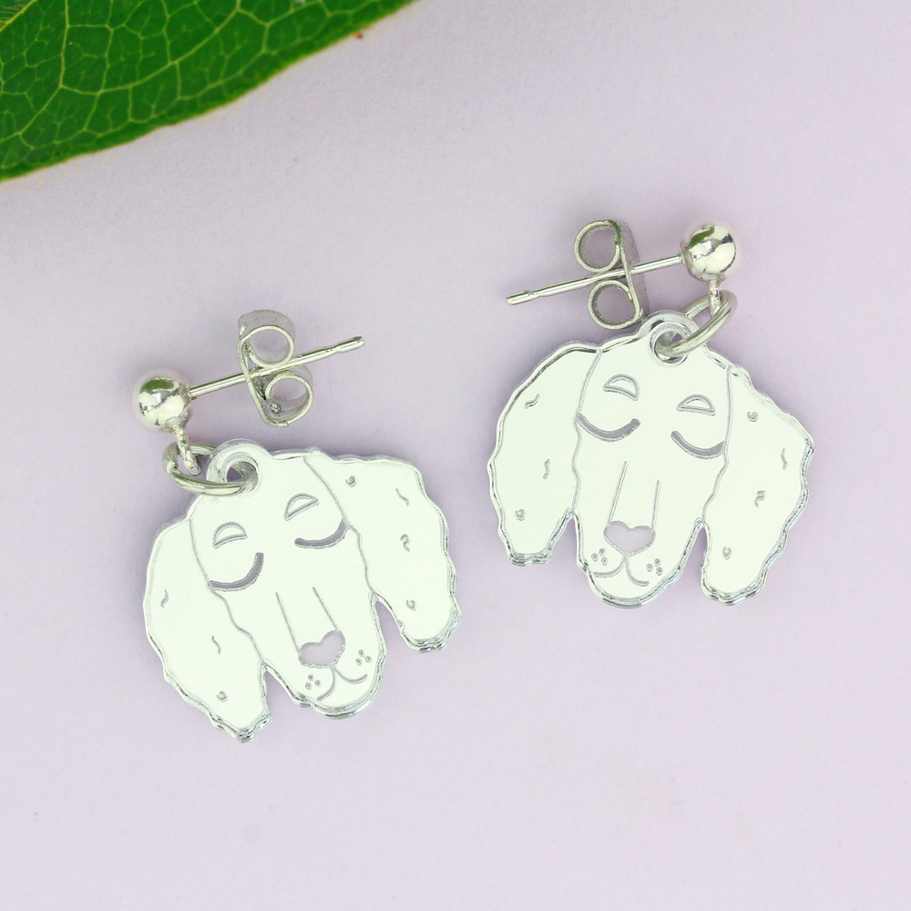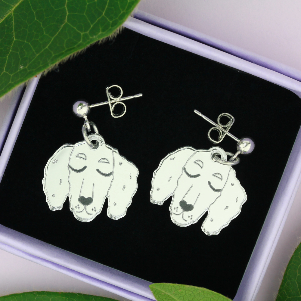 Are you ready for this pair of playful pooches? Our silver dachshund earrings feature one of our original illustrations etched onto an easy to wear mirror silver acrylic. The perfect companion, without any of the responsibilities!