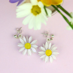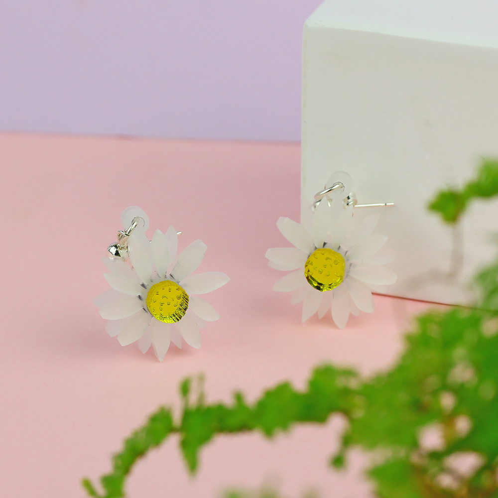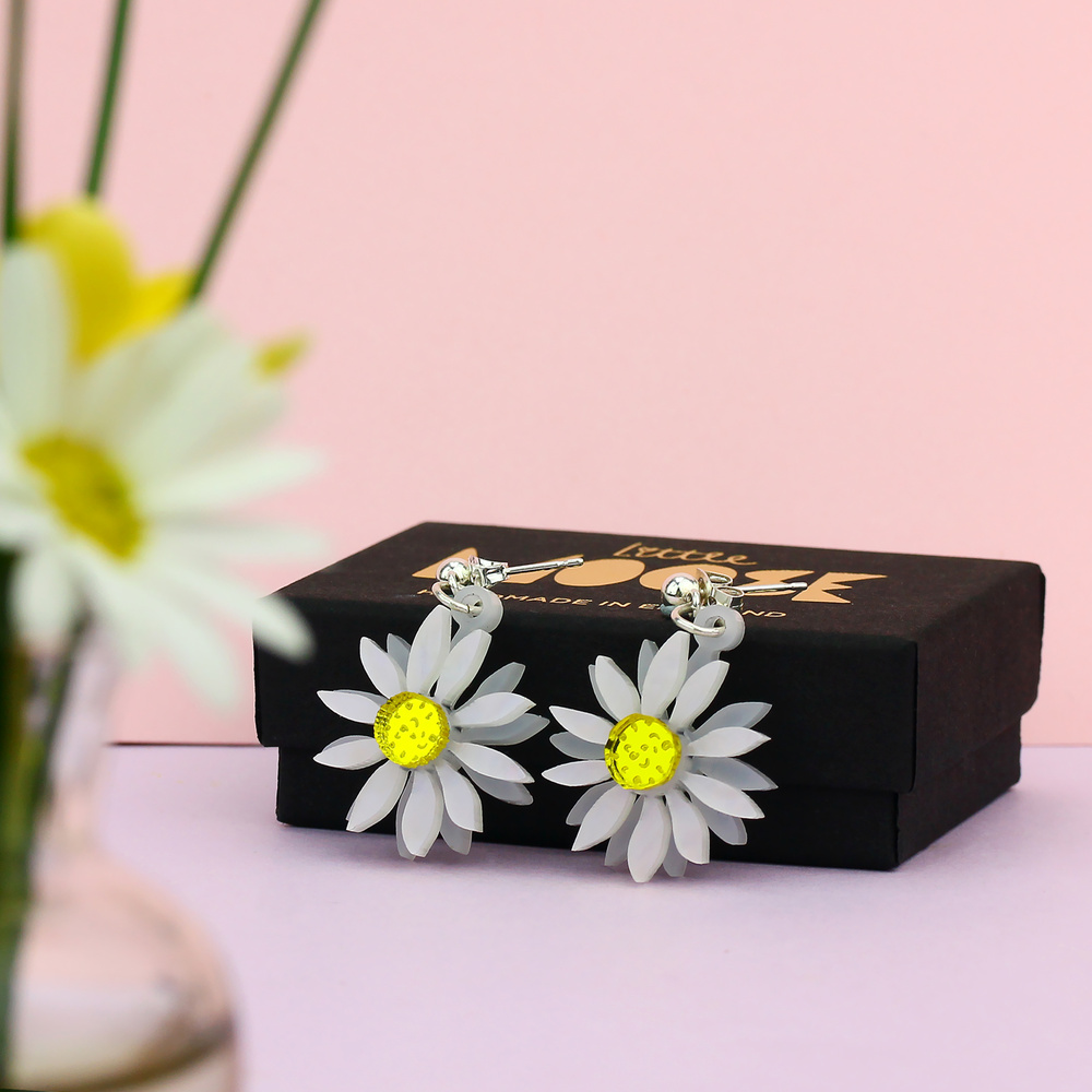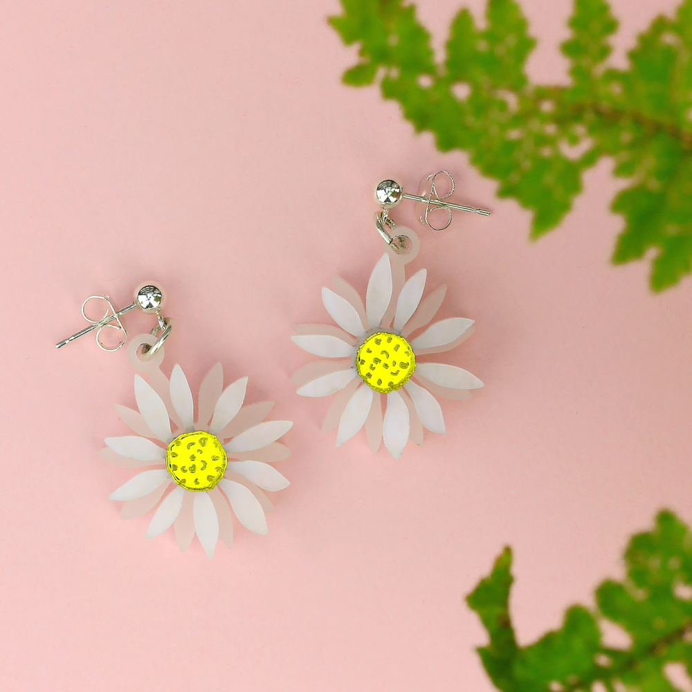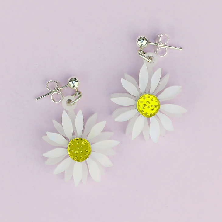 Our daisy earrings are handcrafted in our Sussex studio from layers of laser cut acrylic. A white frosted back layer of petals is topped by a beautiful, shimmering mother of pearl with a bright, mirrored yellow centre. These simple earrings are elegant and easy to wear, what is there not to like.