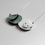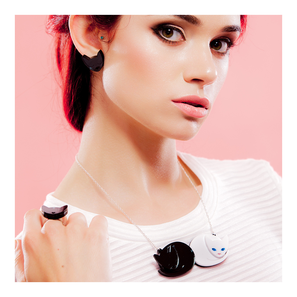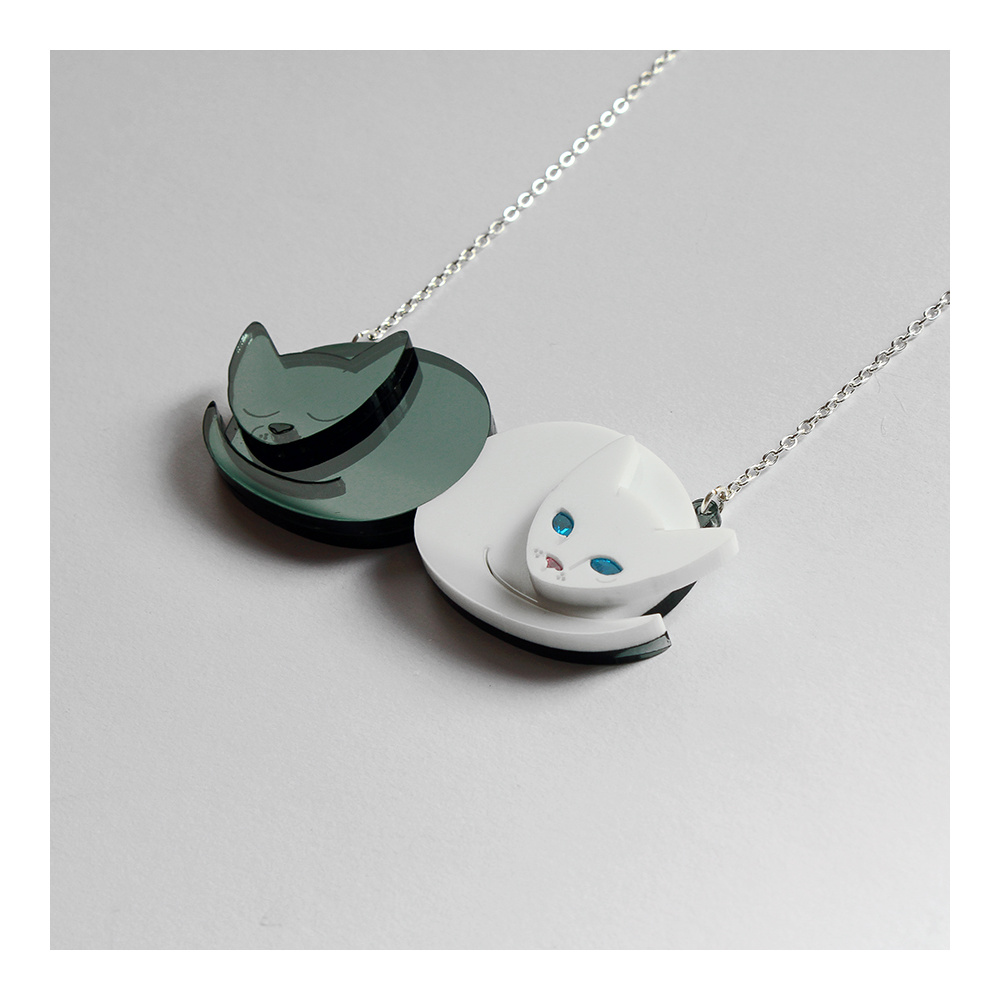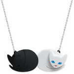 This necklace might just be the purrrrfect example of the luxury life of cats. This charming necklace features two curled up cats, one white and one black. Our white kitty is ready for playtime, with its bright blue eyes wide open and pink nose sparkling with excitement. His black feline friend is content to stay snuggled up and relax. A lovely (furry) yin and yang expression.