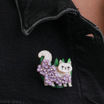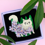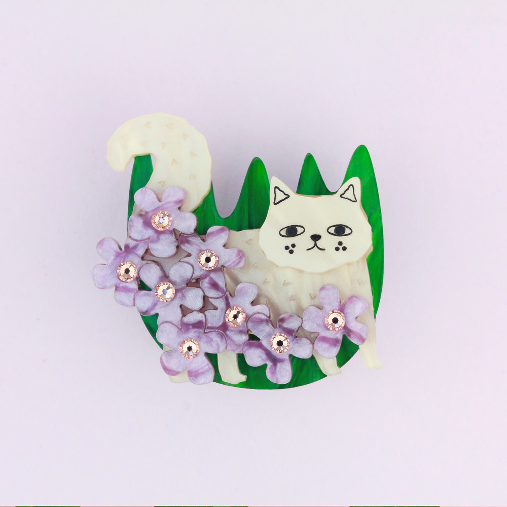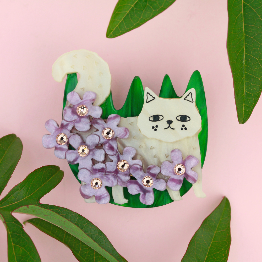 Our cute cat is happily hiding away amongst the lilac garden flowers, what a lovely life to lead. This brooch features an array of lovely marbled acrylics, hand inked and etched detail and sprinkling of sparkling crystals. Each brooch is handmade in small batches.