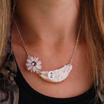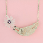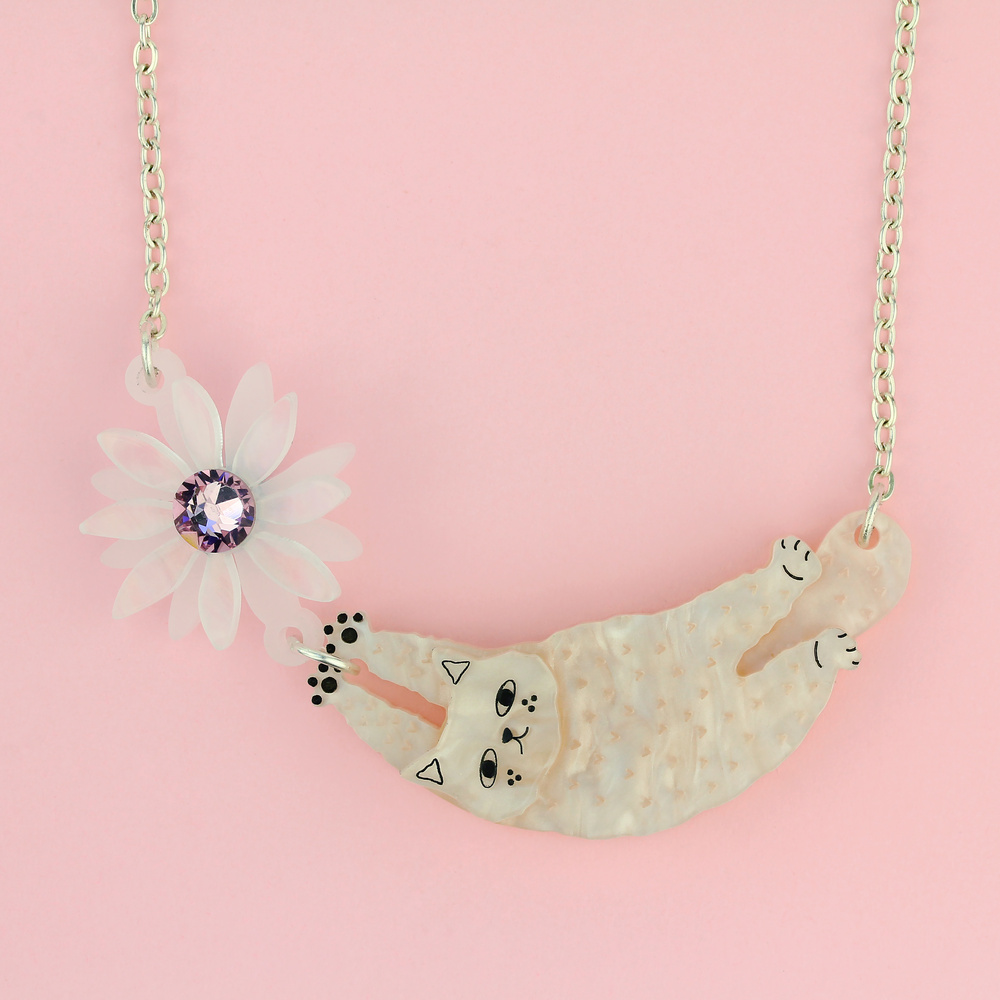 This playful necklace features a wonderfully quirky cat chasing a white, iridescent flower in the breeze. The flower features a large pink crystal. Handmade in England, this necklace is a purrrrfect addition to your outfit. The cat is lovingly created from laser cut and etched golden cream marbled acrylic and features hand inked details to finish.