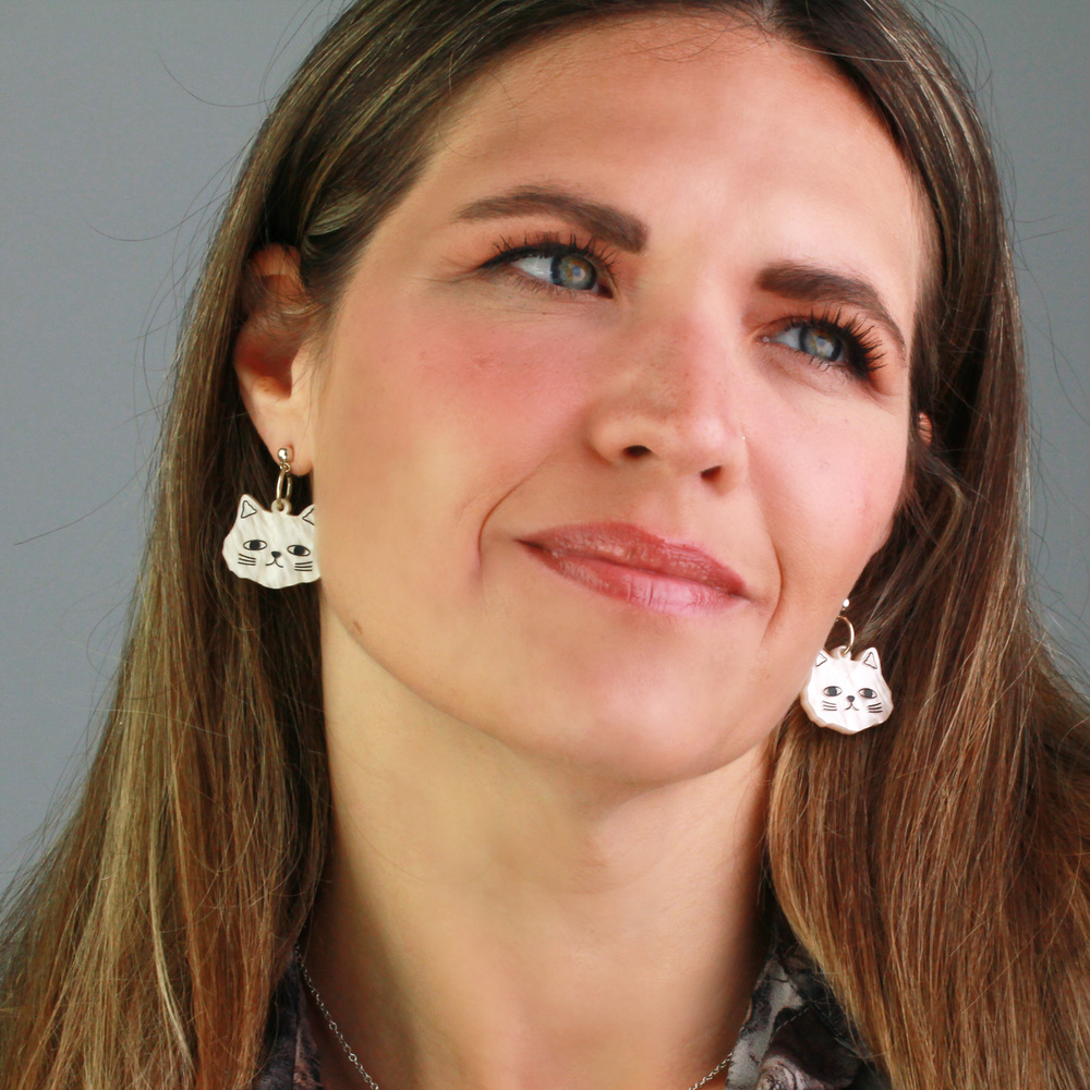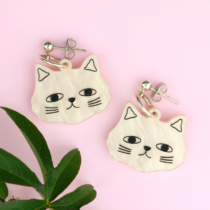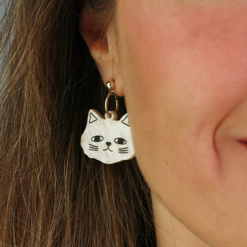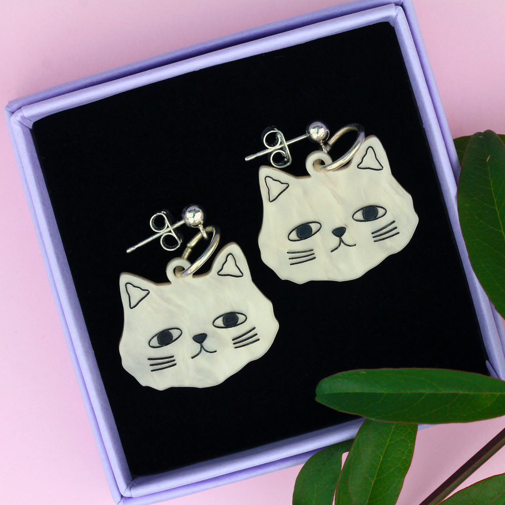 Looking for the purrrrfect pair of earrings? then look no further. Our playful cat head earrings are an easy way to add some character to your look. These earrings are a lovely warm golden cream colour. We hand ink every pair with a quirky face.