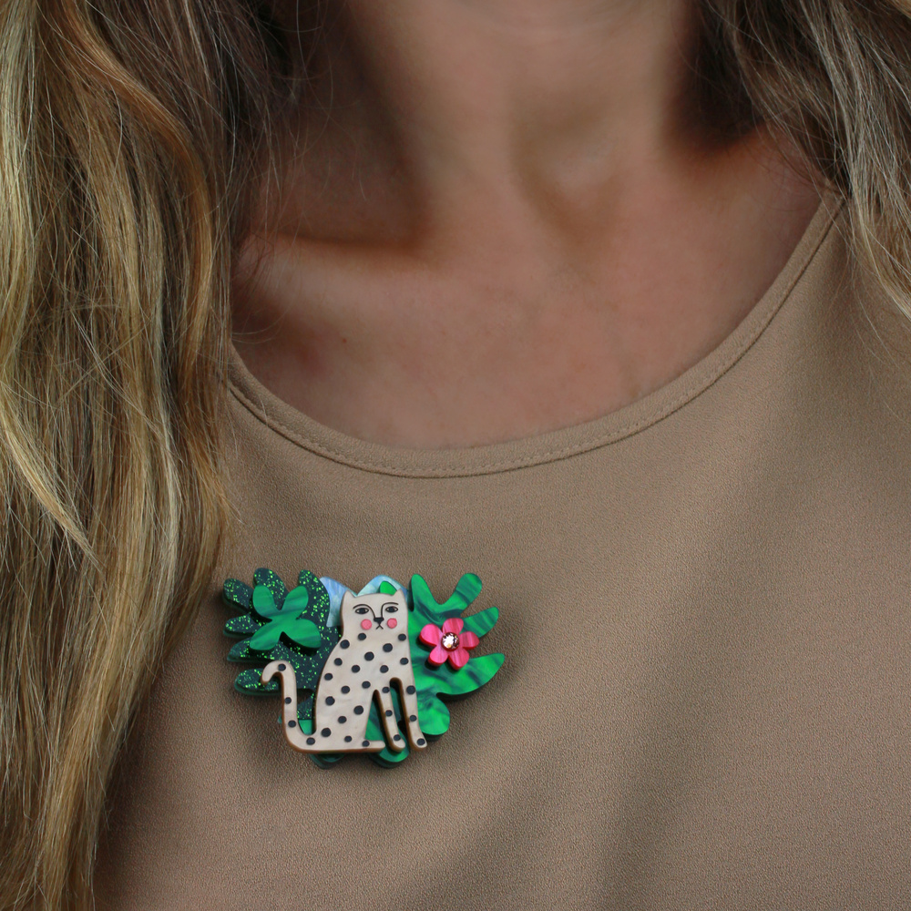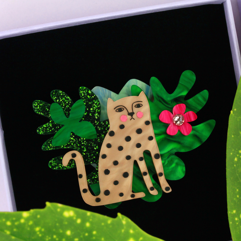 Our leopard brooch has been lovingly recreated from the playful doodle artwork of Little Moose co-founder Carrie to capture the free flowing, doodle aesthetic of her illustrations. Each brooch is hand inked and features a truly gorgeous marbled acrylics. Handmade in England by our talented team.