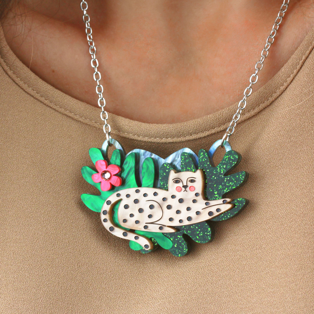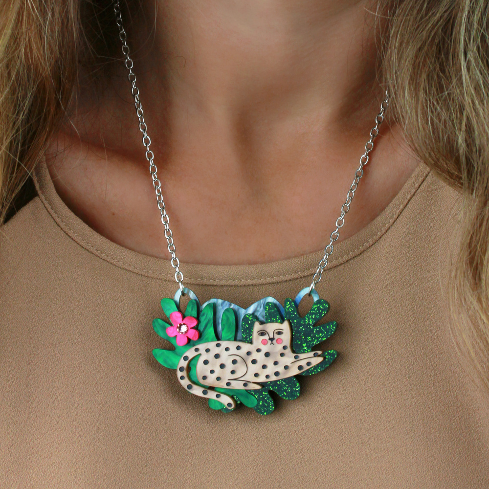 Handsome leopard necklace in a playful doodle art style from the weird and wacky mind of Little Moose co-founder Carrie. Each leopard is hand inked, and this necklace features unusual and uncommon marbled acrylics that ensure a unique, no two the same look. You'll be sure to get spotted wearing this!
