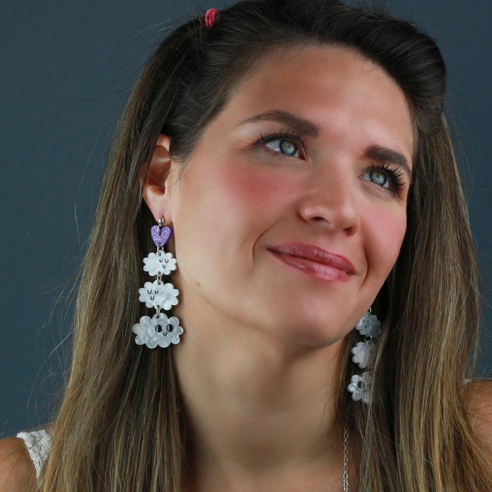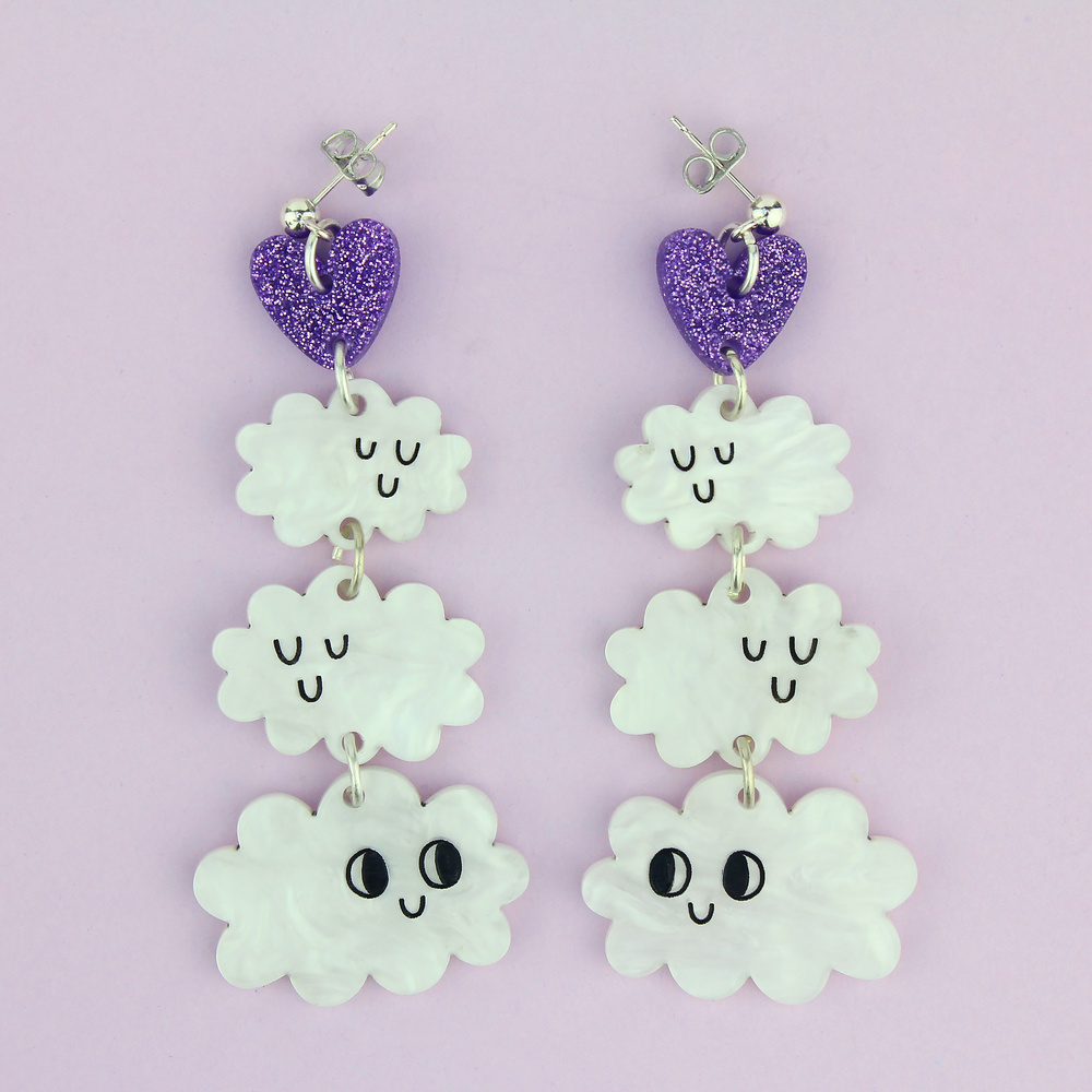 The perfect earrings for a daydreamer who spends time with their head in the clouds. Hanging beneath a gorgeous glitter lilac heart, our cascading clouds all have hand-inked faces on a swirling white marbled acrylic. From the mind of doodle wizard and Little Moose co-founder Carrie, doodllery takes her endless doodles and turns them into wearable pieces of playful jewellery.