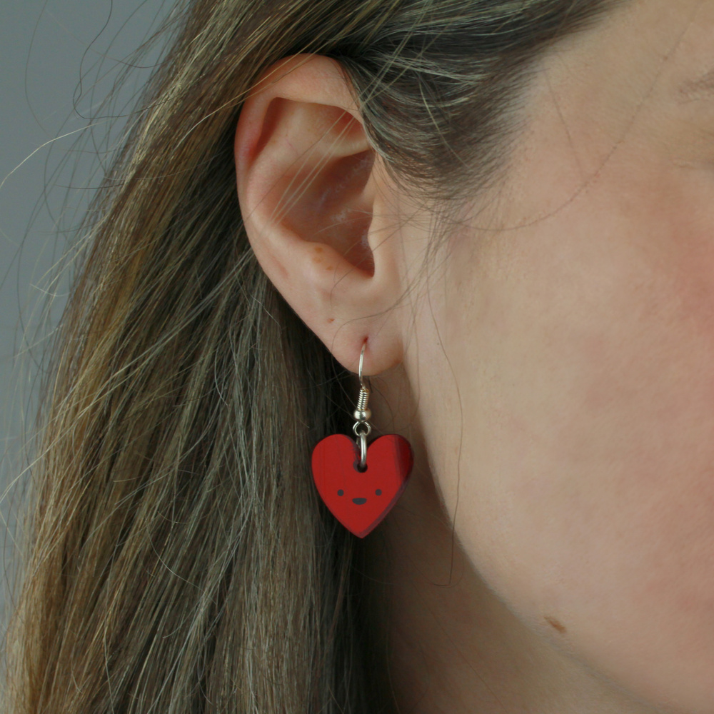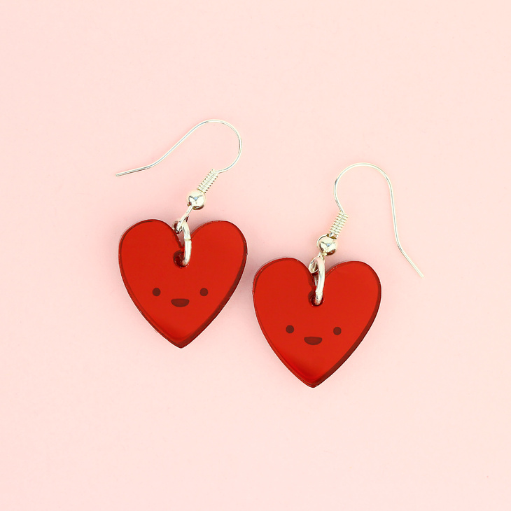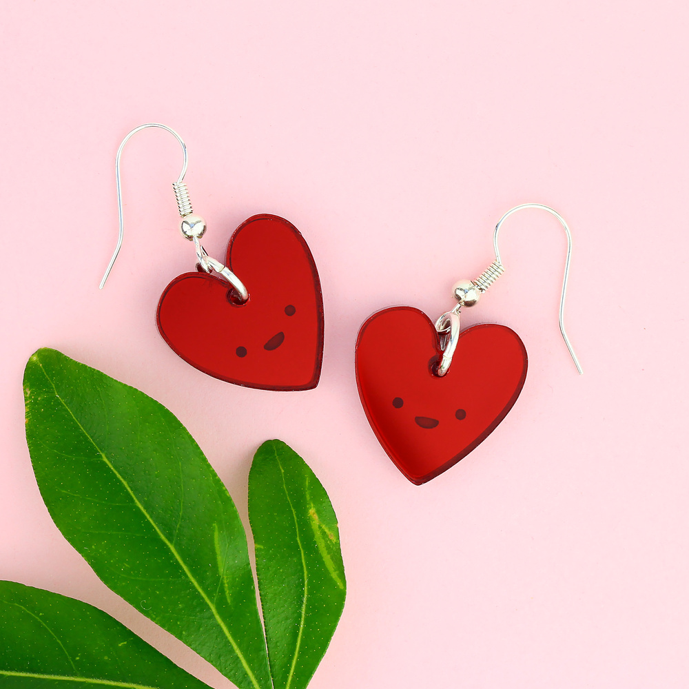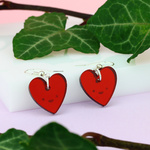 We LOVE these cute, easy to wear smiling heart earrings. The perfect way to brighten up your day. Handmade in our Sussex studio from laser cut and etched deep red mirrored acrylic.