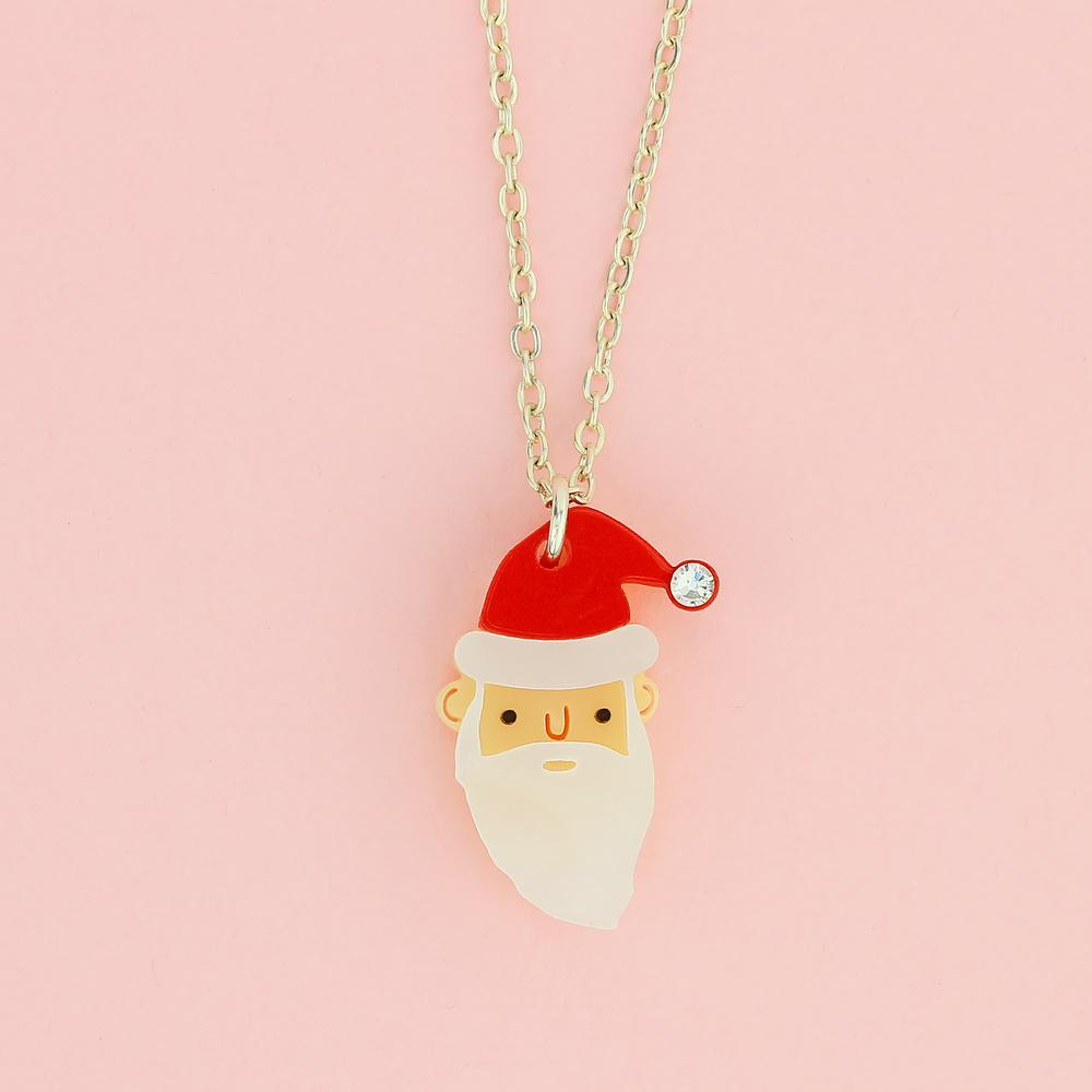 There's nothing secret about this Santa, wear this jolly chap out and about with pride. Handmade in England from laser cut acrylic, our Father Christmas charm necklace features a pearly white beard, marbled red hat and a glistening crystal.