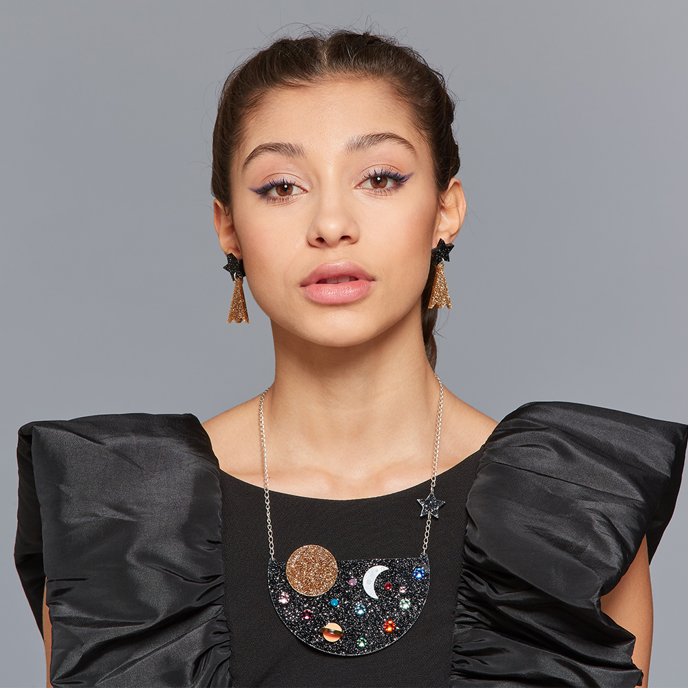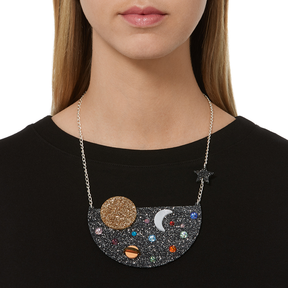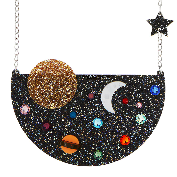 This striking necklace is made from glitter black and gold, laser cut, perspex and sprinkled with a handful of colourful crystals. A star charm hangs from the 16" chain and a pearl etched crescent moon beams amongst the colourful crystals. Stare at this piece for too long and you might find yourself lost in space.