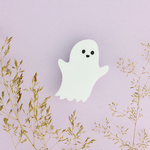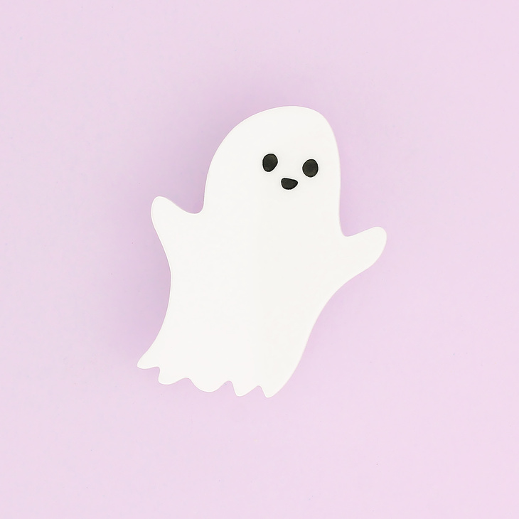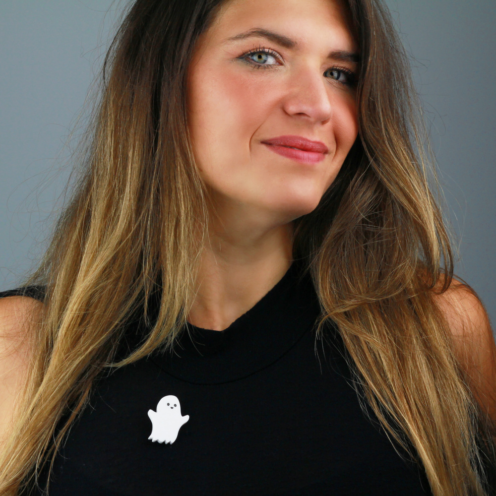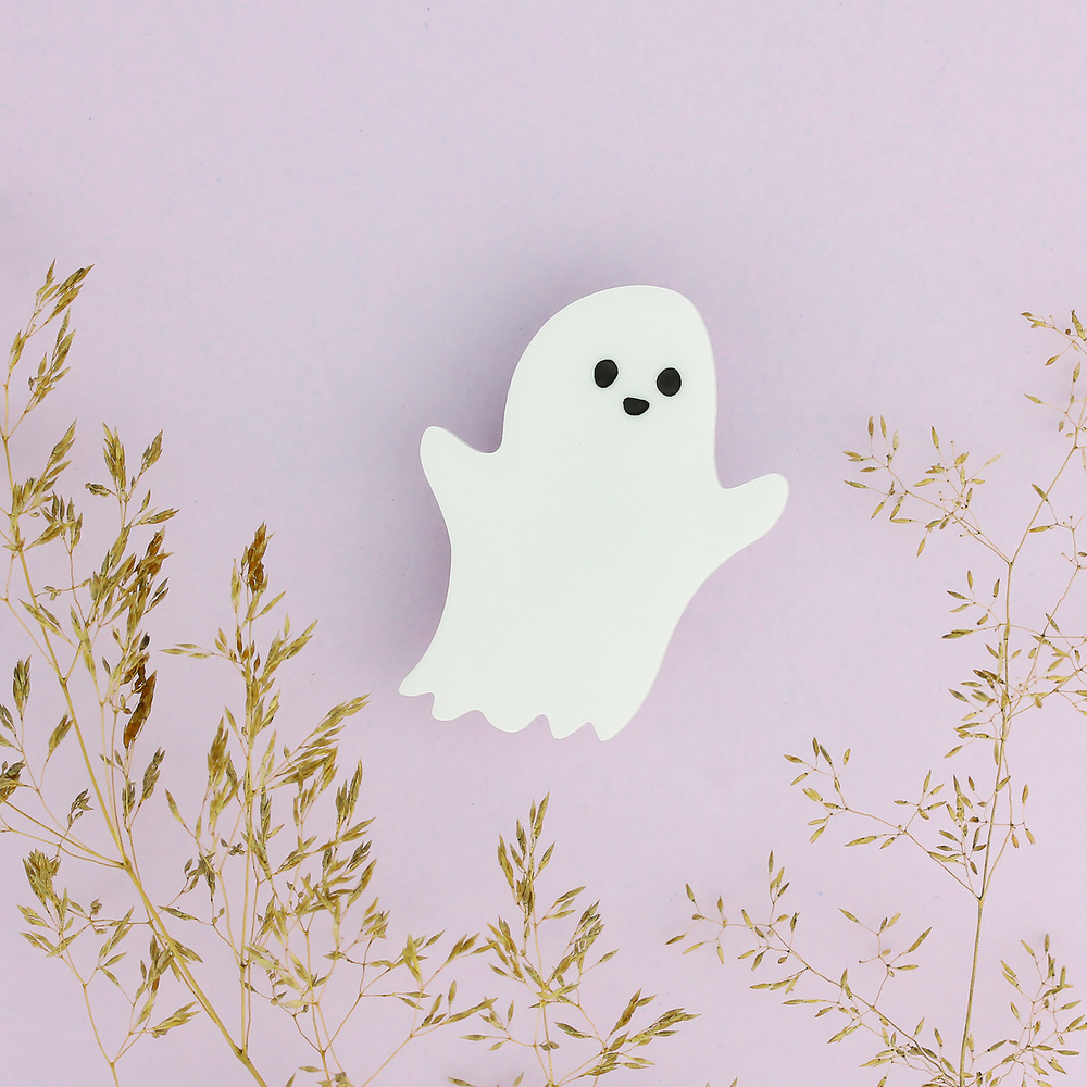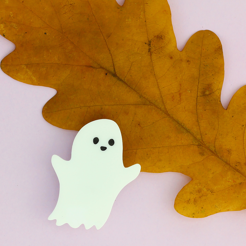 Our cheeky ghost brooch is more than ready to spook its way into your outfit ensemble. This amazing apparition has been laser cut from brilliant white acrylic before having his face carefully hand inked in our Sussex studio. Stupendously spooky.