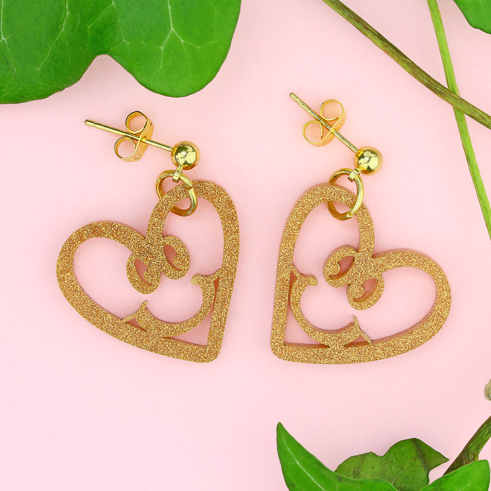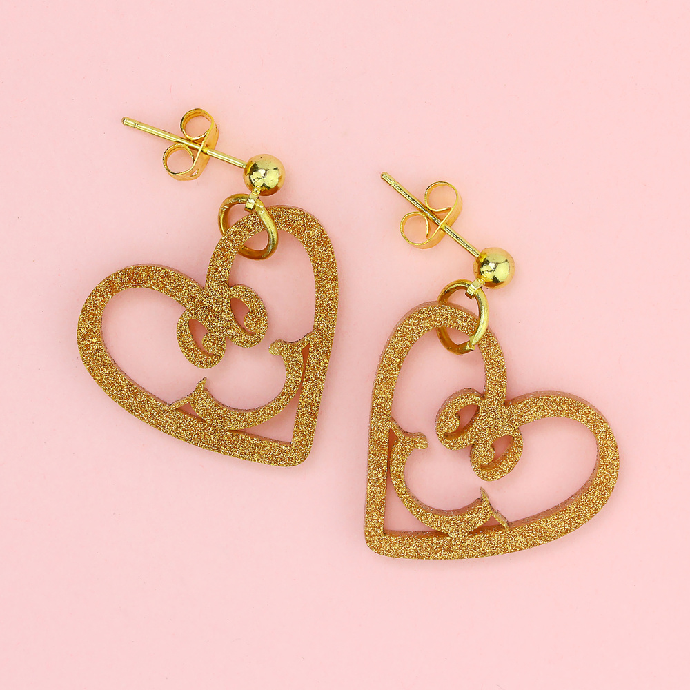 Put a smile on your face, and your ears, with our playful smiley face earrings. These smiling heart earrings are made from an intensely glittered gold acrylic and hang from gold plated drop studs.