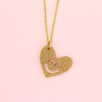 Hearts, Glitter. Smiles. What more could you want? Our playful smiling heart necklace features a cut out smiley face, making this a simple, easy way to add a touch of playful razzle-dazzle to any outfit. Handmade from the glitteriest gold acrylic you ever did see.