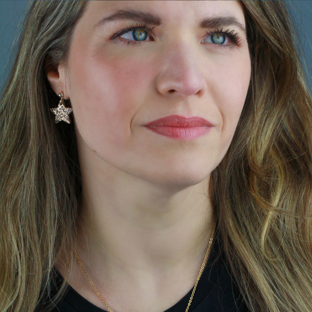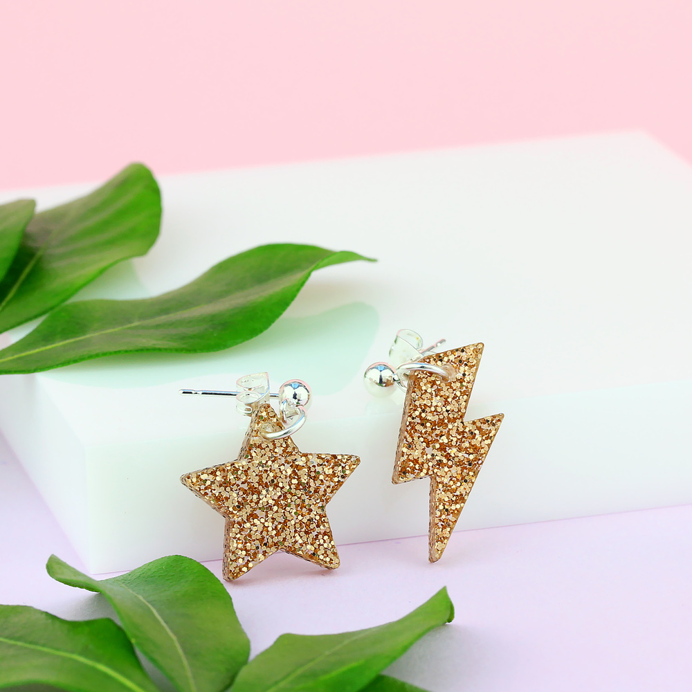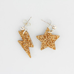 Lovely gold mix and match earring set featuring a glittery star and lightning bolt on silver plated drop studs. For when you can't decide if you are feeling celestial or stormy. Easy to wear whatever the occasion.