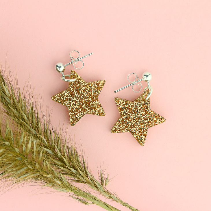 Add some celestial sparkle to your look with these picture perfect glitter gold star earrings.