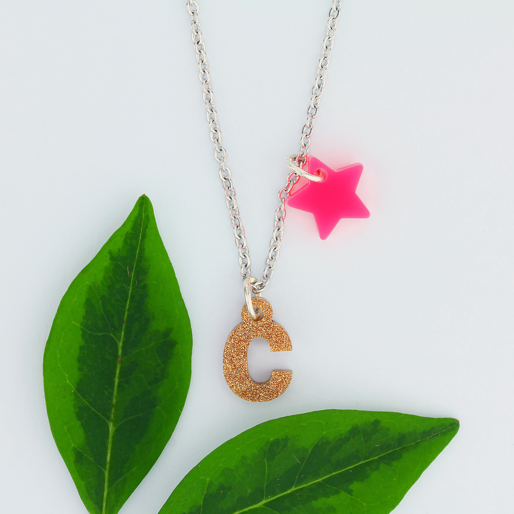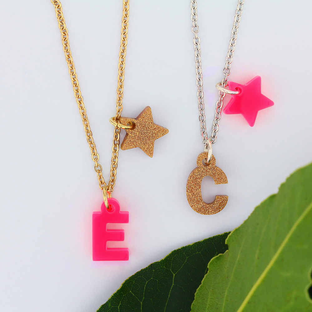 A E I O U need to add this cute letter charm necklace to your collection. Whether you're picking this up as a gift, or for yourself, our personalised initial charm necklace is sure to give you the warm and fuzzies. A glitter gold letter of your choosing sits alongside a neon pink star on your choice of gold plated or silver tone chain.