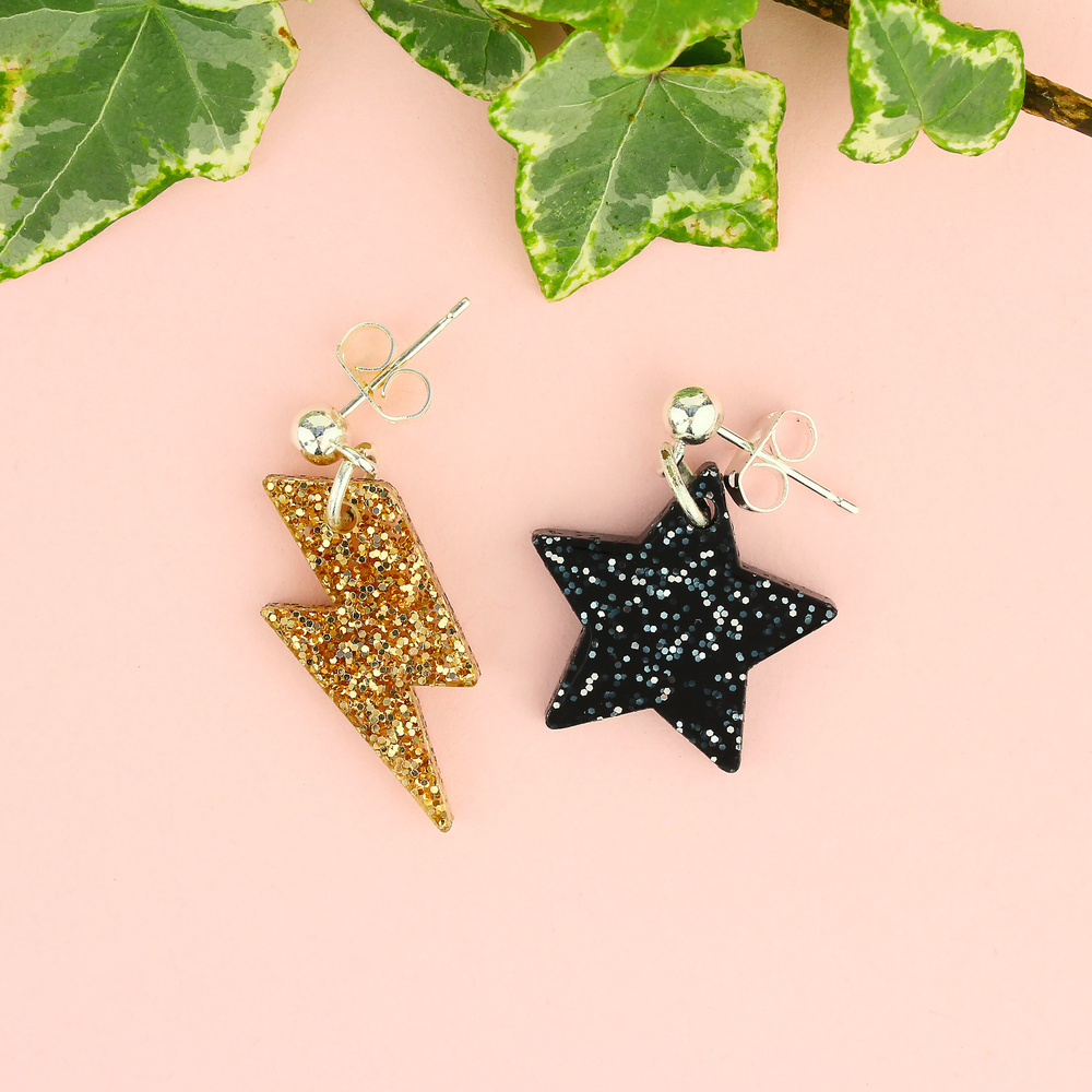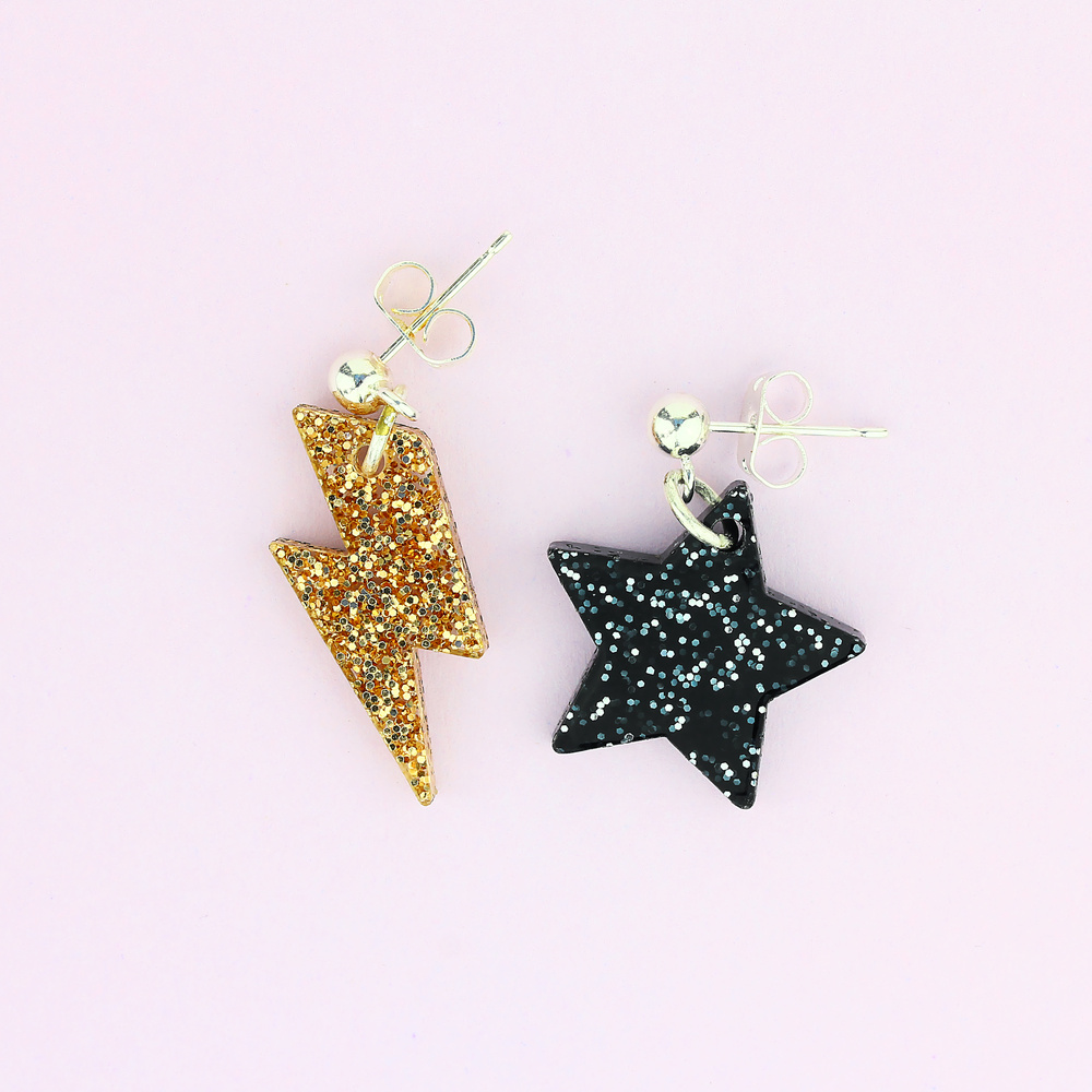 Mix and match your way through the day with our easy to wear glitter star and lightning bolt studs in black and gold. If you can't make your mind up, don't stress!