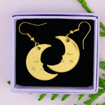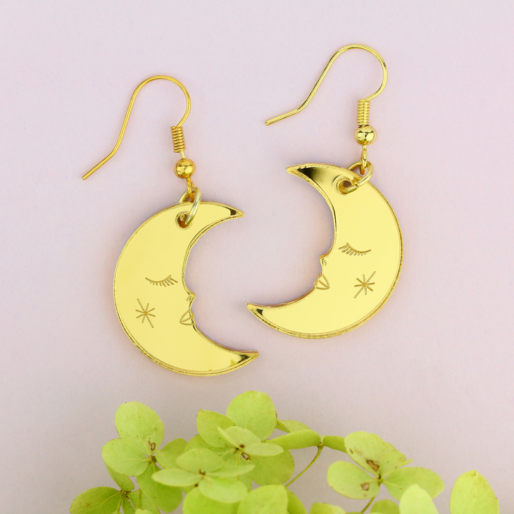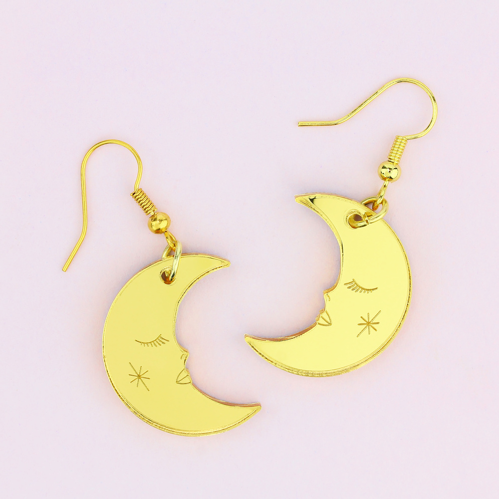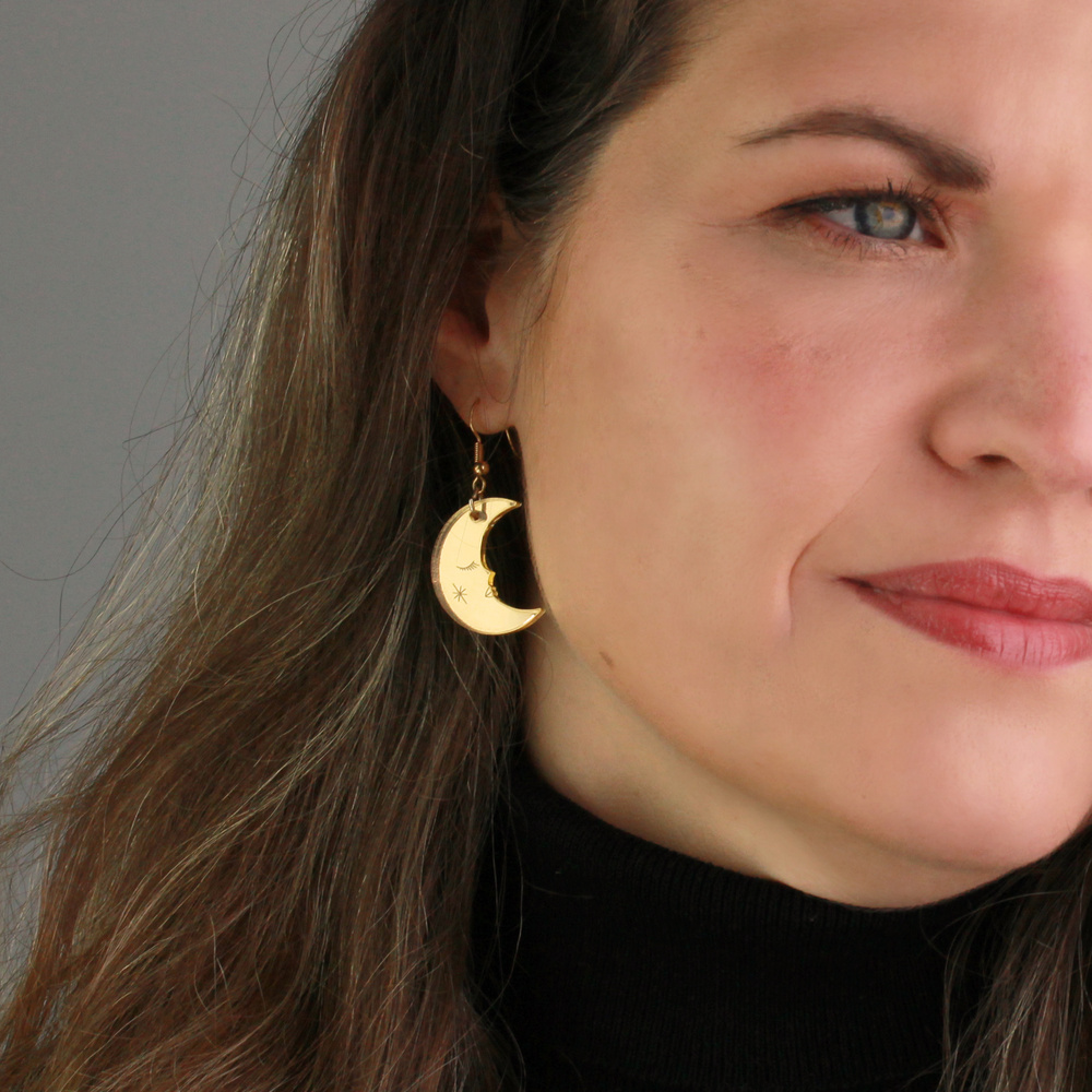 Our gloriously golden moon face earrings are the perfect accessory, day or night. Handmade from laser etched mirrored gold acrylic and available on gold plated or hypoallergenic stainless steel hooks.