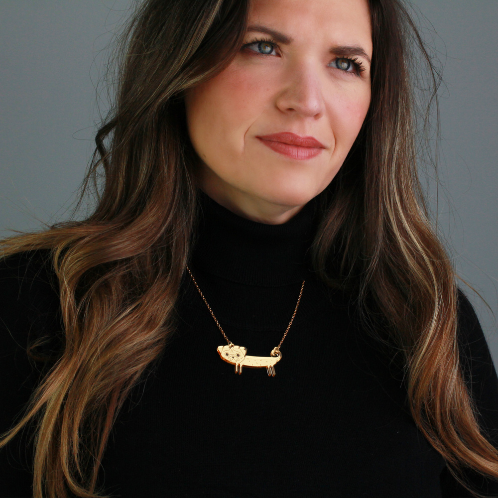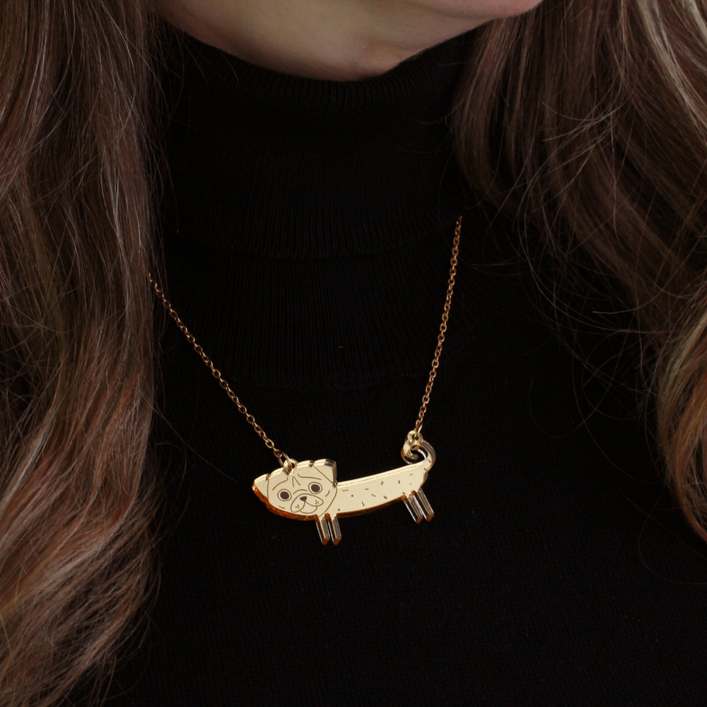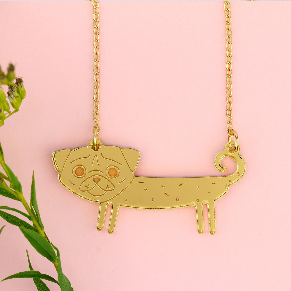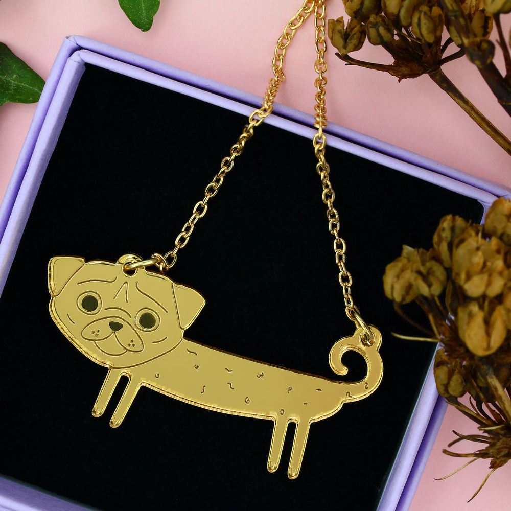 Pug me, this necklace is adorable (even if we do say so ourselves). This little pug is one of our original illustrations etched onto a glitzy mirror gold acrylic. Puggin perfec'.