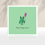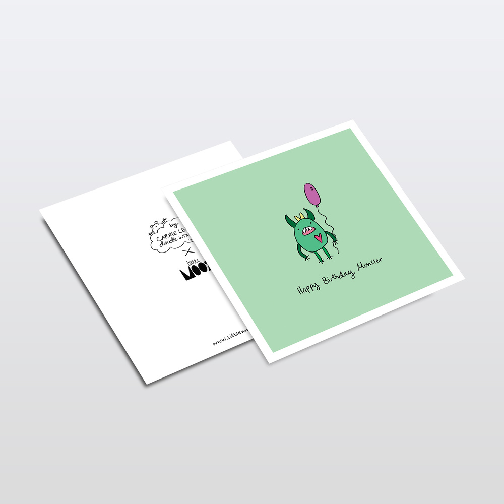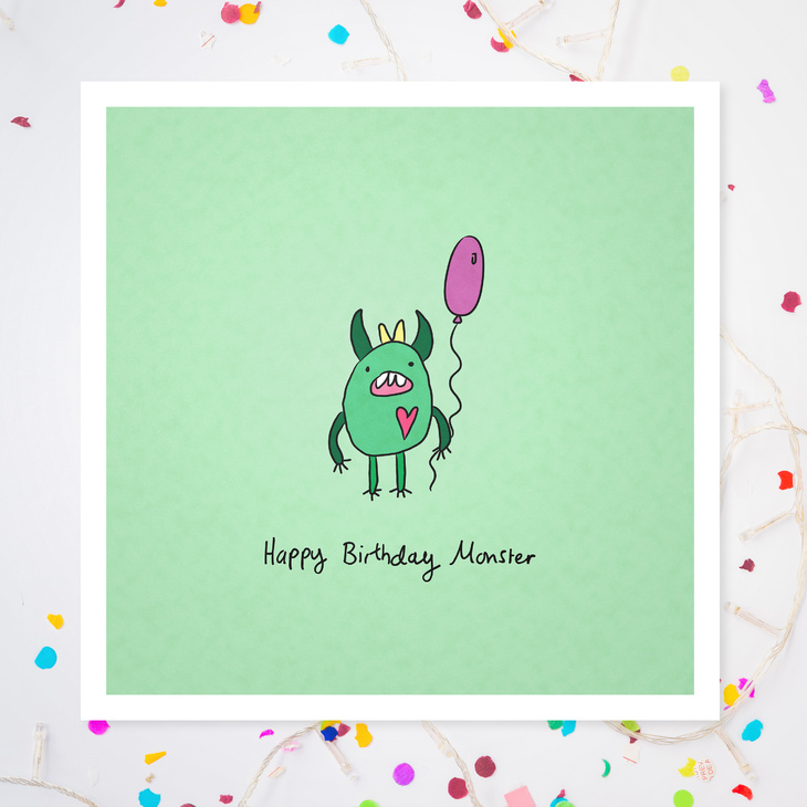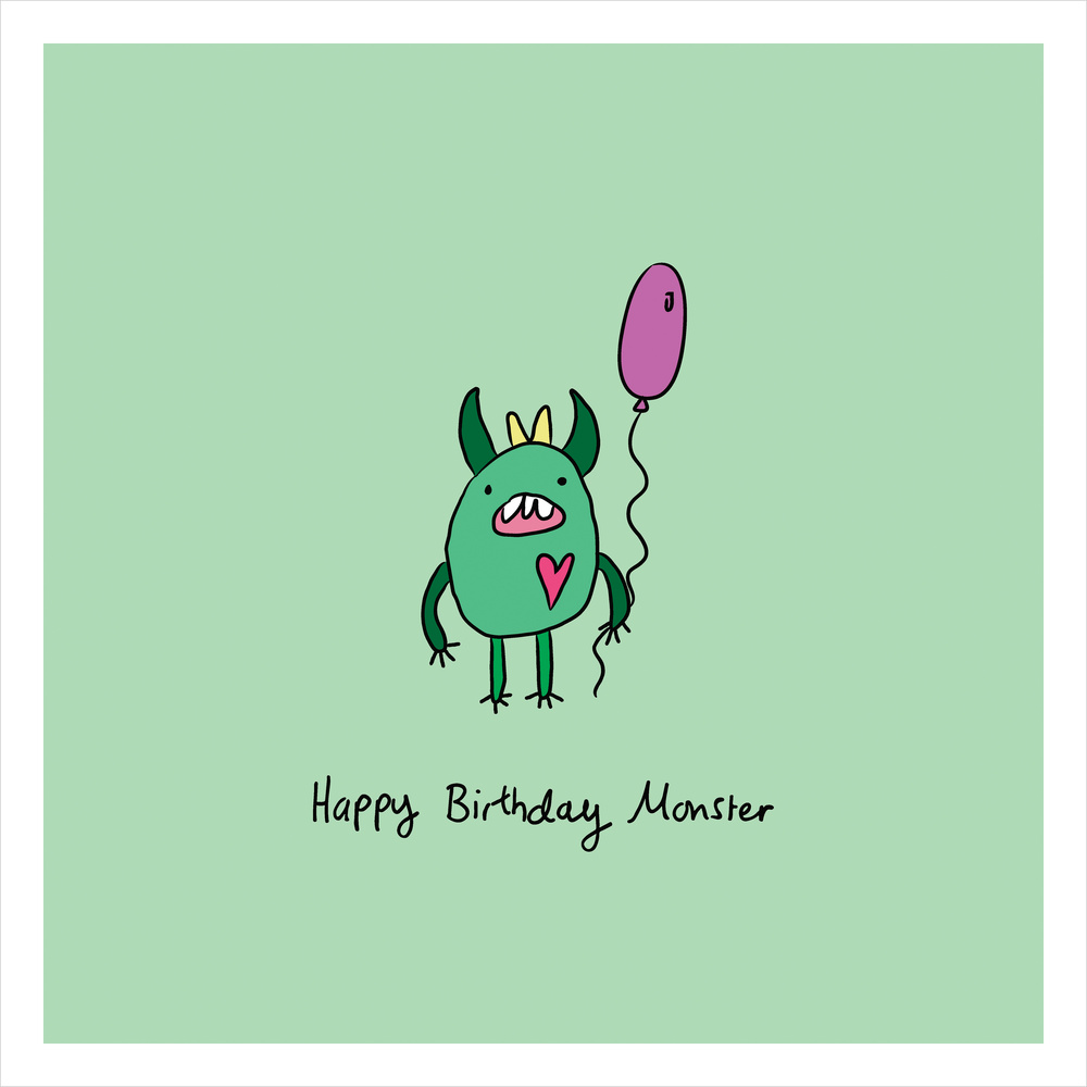Cute illustrated monster birthday card by illustrator Carrie Lewis, Doodle Wizard. Perfect for celebrating birthdays of all ages or for a special little monster of your your own.