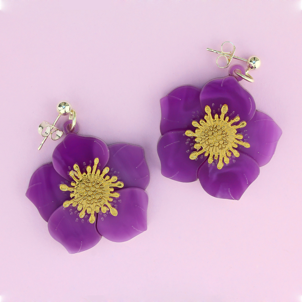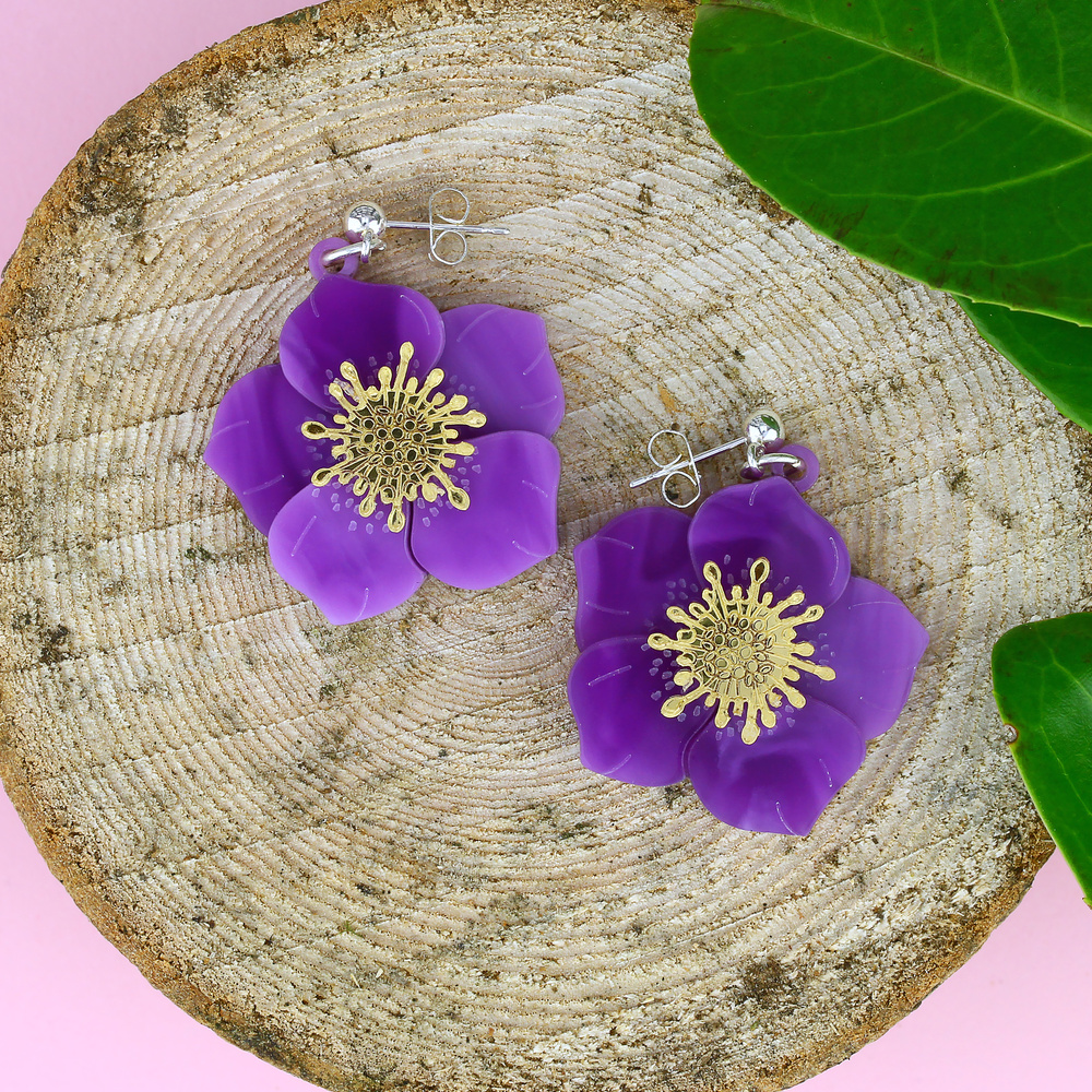 Our purple hellebores are handmade from pieces of beautiful swirling purple and striking mirrored gold perspex in our Sussex studio. Our hellebore earrings are sure to put a spring in your step.