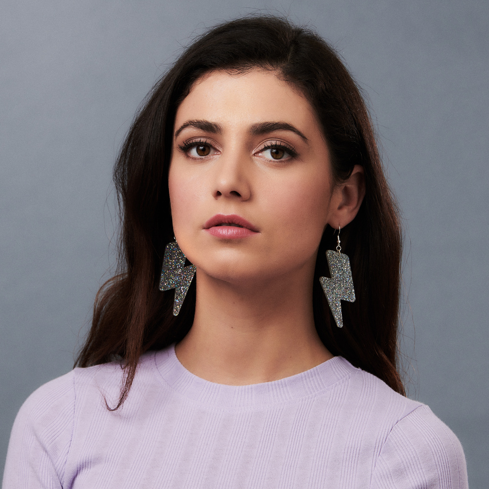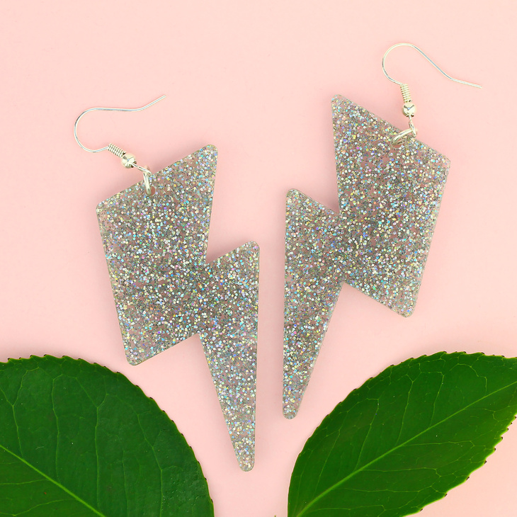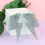 Statement lightning bolt earrings. Handmade from a holographic glittered silver acrylic that sparkles with all of the colours in the rainbow. We use hypoallergenic earring hooks to keep your ears happy.