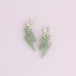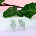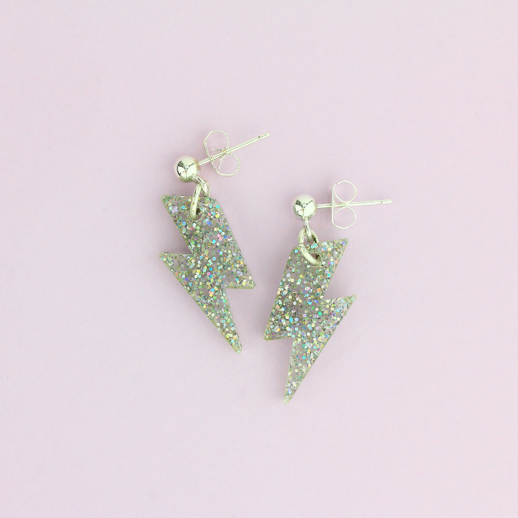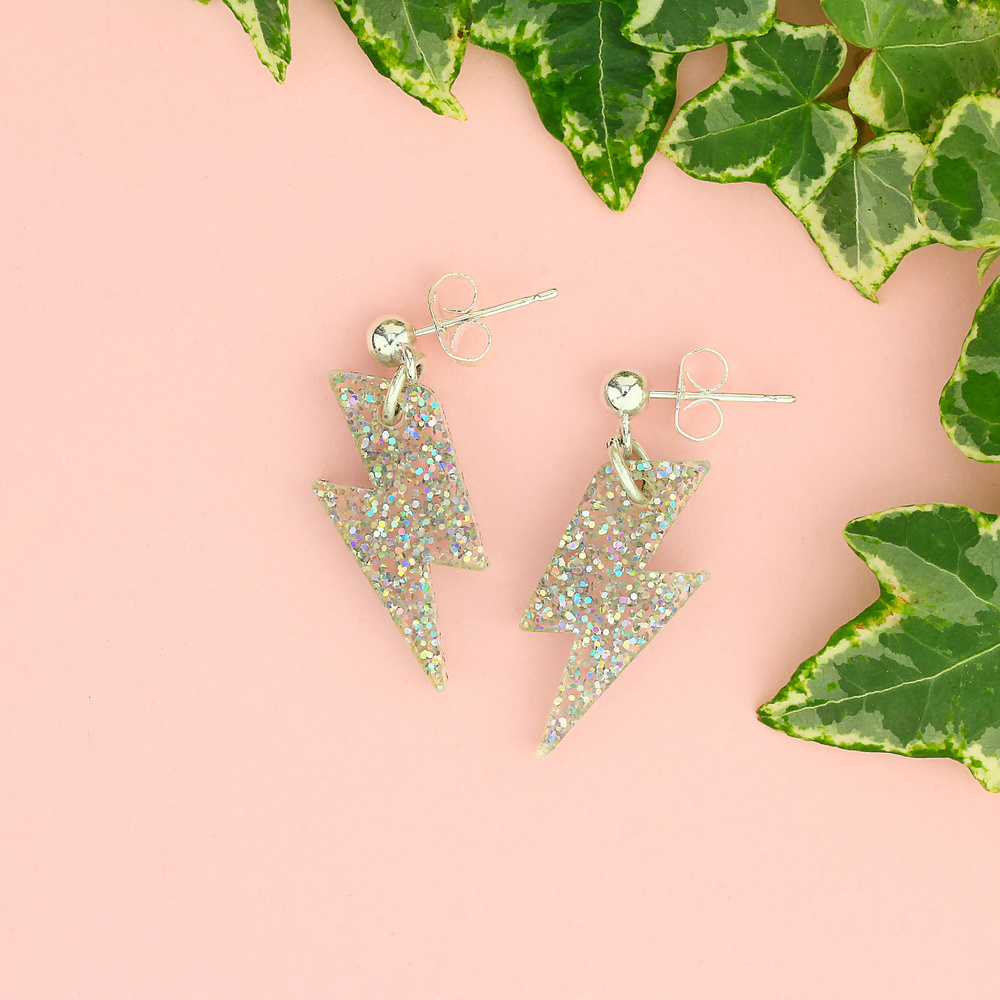 There isn't anything frightening about these thunderbolt and lightning stud earrings. Handmade in our Sussex studio, these simple studs are made from a lovely holographic glitter acrylic that is flecked with all of the colours of the rainbow.