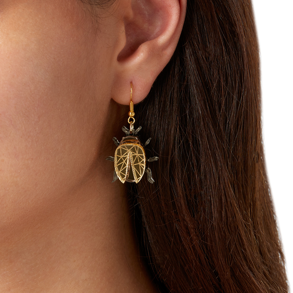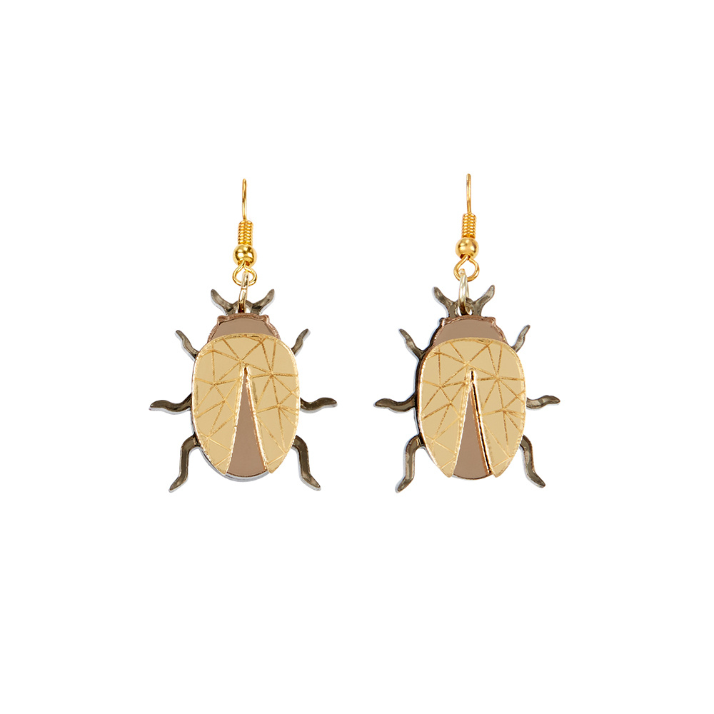 These are bugs you won't mind buzzing around your hair! Our contemporary insect earrings are made from 3 layers of mirrored perspex, giving them a real depth. They are finished off with an intricate etched geometric pattern and hang from gold plated hooks. Perfect for fashionistas or budding entomologists.